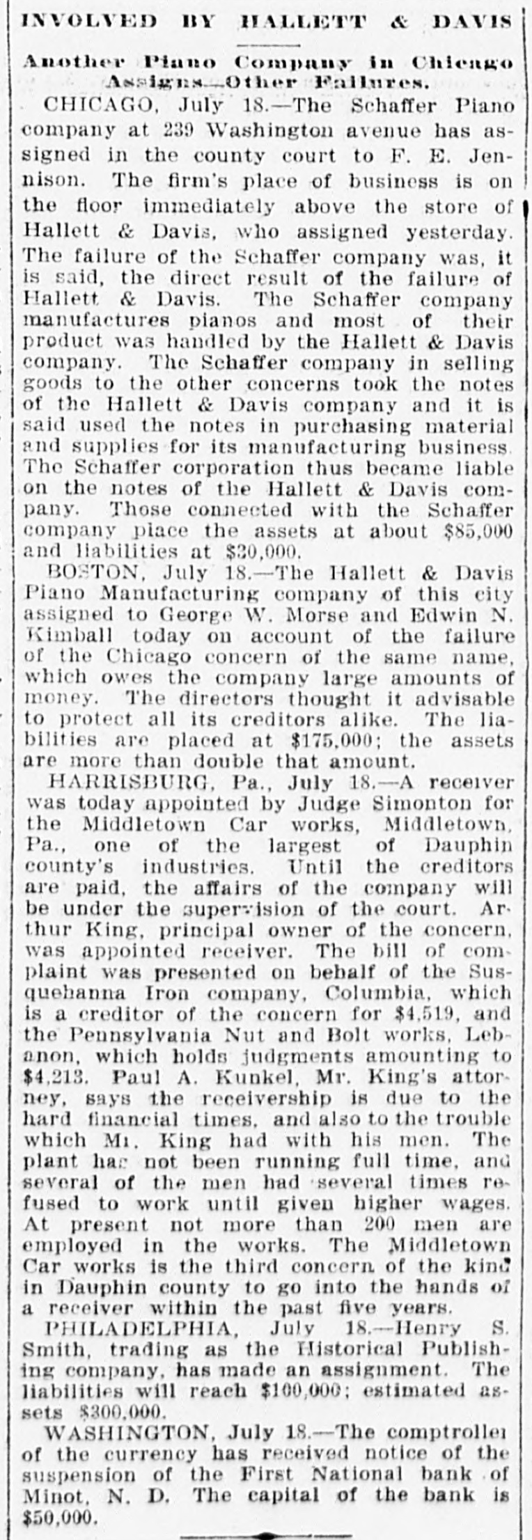 INVOLVED BY HALLETT & DAVIS Another Plano Company in Chicago Assigns Other Failures. CHICAGO, July 18.-The Schaffer Piano company at 239 Washington avenue has assigned in the county court to F. E. Jennison. The firm's place of business is on the floor immediately above the store of Hallett & Davis, who assigned yesterday. The failure of the Schaffer company was, it is said, the direct result of the failure of Hallett & Davis. The Schaffer company manufactures pianos and most of their product was handled by the Hallett & Davis company. The Schaffer company in selling goods to the other concerns took the notes of the Hallett & Davis company and it is said used the notes in purchasing material and supplies for its manufacturing business. The Schaffer corporation thus became liable on the notes of the Hallett & Davis company. Those connected with the Schaffer company place the assets at about $85,000 and liabilities at $30,000. BOSTON, July 18.-The Hallett & Davis Piano Manufacturing company of this city assigned to George W. Morse and Edwin N. Kimball today on account of the failure of the Chicago concern of the same name, which owes the company large amounts of money. The directors thought it advisable to protect all its creditors alike. The liabilities are placed at $175,000; the assets are more than double that amount. HARRISBURG, Pa., July 18.-A receiver was today appointed by Judge Simonton for the Middletown Car works, Middletown, Pa., one of the largest of Dauphin county's industries. Until the creditors are paid, the affairs of the company will be under the supervision of the court. Arthur King, principal owner of the concern, was appointed receiver. The bill of complaint was presented on behalf of the Susquehanna Iron company, Columbia, which is a creditor of the concern for $4,519, and the Pennsylvania Nut and Bolt works, Lebanon, which holds judgments amounting to $4,213. Paul A. Kunkel, Mr. King's attorney, says the receivership is due to the hard financial times, and also to the trouble which Mi. King had with his men. The plant has not been running full time, and several of the men had several times refused to work until given higher wages. At present not more than 200 men are employed in the works. The Middletown Car works is the third concern of the kind in Dauphin county to go into the hands of a receiver within the past five years. PHILADELPHIA, July 18.-Henry S. Smith, trading as the Historical Publishing company, has made an assignment. The liabilities will reach $100,000; estimated assets $300,000. WASHINGTON, July 18.-The comptroller of the currency has received notice of the suspension of the First National bank of Minot, N. D. The capital of the bank is $50,000.