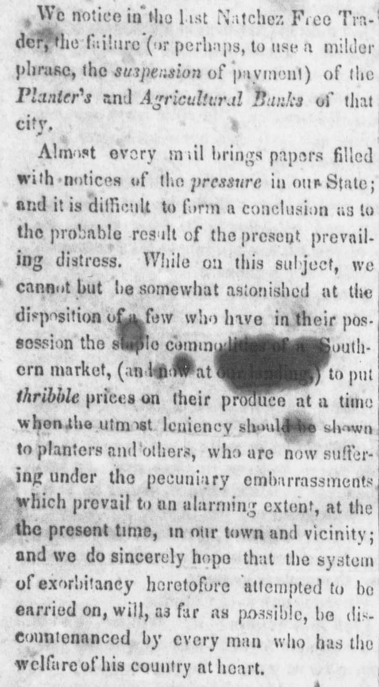 We notice in the list Natchez Free Trader, the failure (or perhaps, to use a milder phrase, the suspension of payment) of the Planter's and Agricultural Banks of that city, Almost every mail brings papers filled with notices of the pressure in our State; and it is difficult to form a conclusion as to the probable result of the present prevailing distress. While on this subject, we cannot but be somewhat astonished at the disposition of a few who have in their possession the staple commodides of Southern market, (androw at outhan ing,) to put thribble prices on their produce at a time when the utmost. leniency should be shown to planters and'others, who are now suffering under the pecuniary embarrassments which prevail to an alarming extent, at the the present time, in our town and vicinity; and we do sincerely hope that the system of exorbitancy heretofure attempted to be earried on, will, as far as possible, be discountenanced by every man who has the welfare of his country at heart.