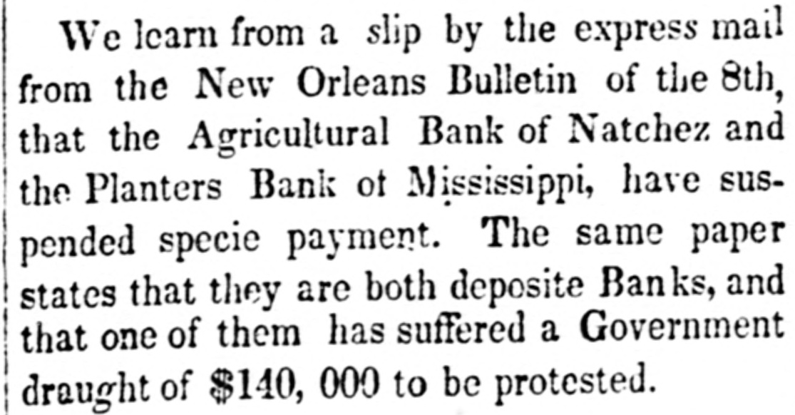 The Agricultural Bank of Natchez ... suspended specie payments on the 4th inst.