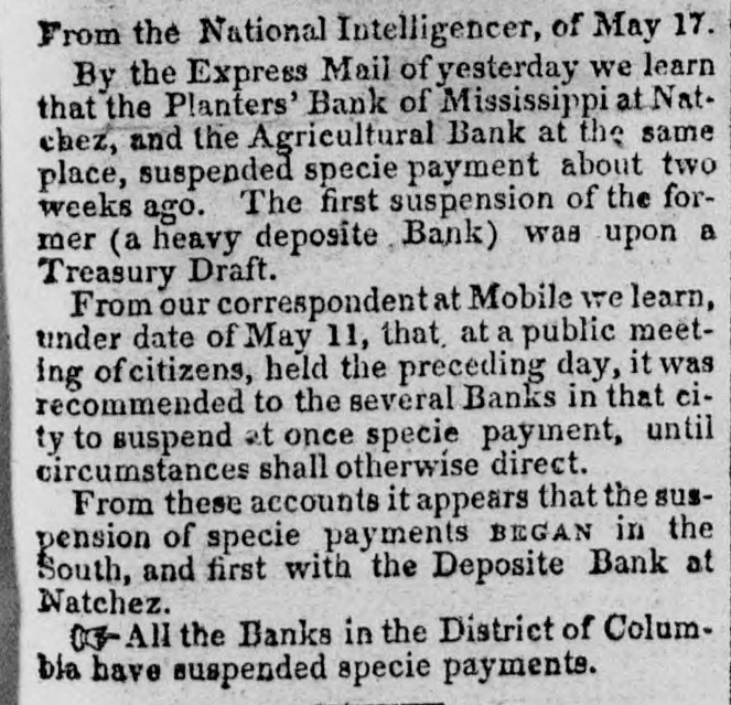 From the National Intelligencer, of May 17. By the Express Mail of yesterday we learn that the Planters' Bank of Mississippi at Natchez, and the Agricultural Bank at the same place, suspended specie payment about two weeks ago. The first suspension of the former (a heavy deposite Bank) was upon a Treasury Draft. From our correspondentat Mobile we learn, under date of May 11, that at a public meeting of citizens, held the preceding day, it was recommended to the several Banks in that city to suspend at once specie payment, until circumstances shall otherwise direct. From these accounts it appears that the suspension of specie payments BEGAN in the South, and first with the Deposite Bank at Natchez. 07- All the Banks in the District of Columbia have suspended specie payments.