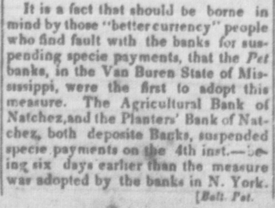 It is a fact that should be borne in mind by those better currency" people who find fault with the banks for suspending specie payments, that the Pet banks, in the Van Burea State of Missssippi, were the first to adopt this measure. The Agricultural Bank of Natchez, and the Planters' Bank of Natchez, both deposite Backs, suspended specie payments on the 4th inst.-se ing six days earlier than the measure war adopted by the banks in N. York. (Belt Pet.