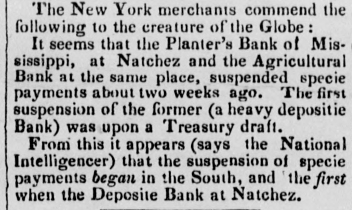 The New York merchants commend the following to the creature of the Globe It seems that the Planter's Bank of Mississippi, at Natchez and the Agricultural Bank at the same place, suspended specie payments about two weeks ago. The first suspension of the former (a heavy depositie Bank) was upon a Treasury draft. From this it appears (says the National Intelligencer) that the suspension of specie payments began in the South, and the first when the Deposite Bank at Natchez.