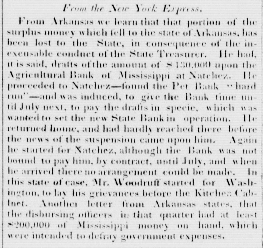 From the Nor York Express. From Arkansas we learn that that portion of the surplus money which fell to the state of Arkansas. has been lost to the State, in consequence of the inexcusable conduct of the State Treasurer. He had, If is said, drafts ofthe amount of 1. 130.000 upon the Agricultural Bank of Mississippi at Natchez. He proceeded to Natchez-found the Pet Bank "hard -and was induced, to give the Bank time IIIItil July next, to pay the drafts in specie, which was wanted to set the new State Bank in operation. 11. returned home, and had hardly reached there before Again the news of the suspension came upon him. he started for Xatchez, although the Bank was not bound to pay him. by contract. until July, and " lien he arrived there no arrangement could be made. In this state of case, Mr. Woodruff started for Washington. to law his grievances before the Kitchen CabInct. Another letter from Arkansas states. that the disbursing officers in that quarter had at least $200,000 of Mississippi money on hand. which were intended to defray government expenses.