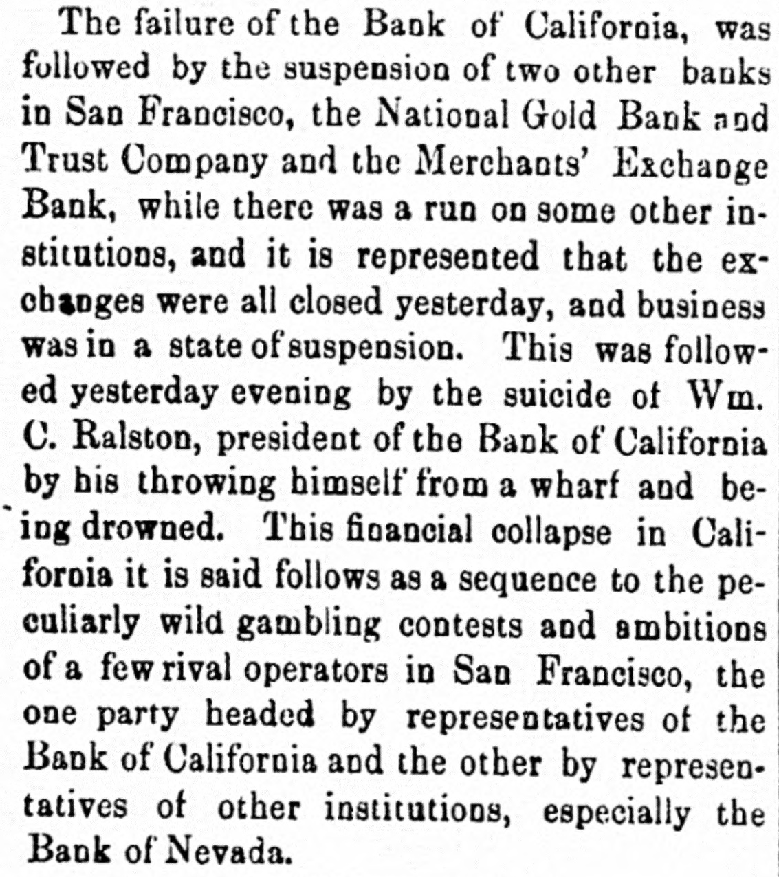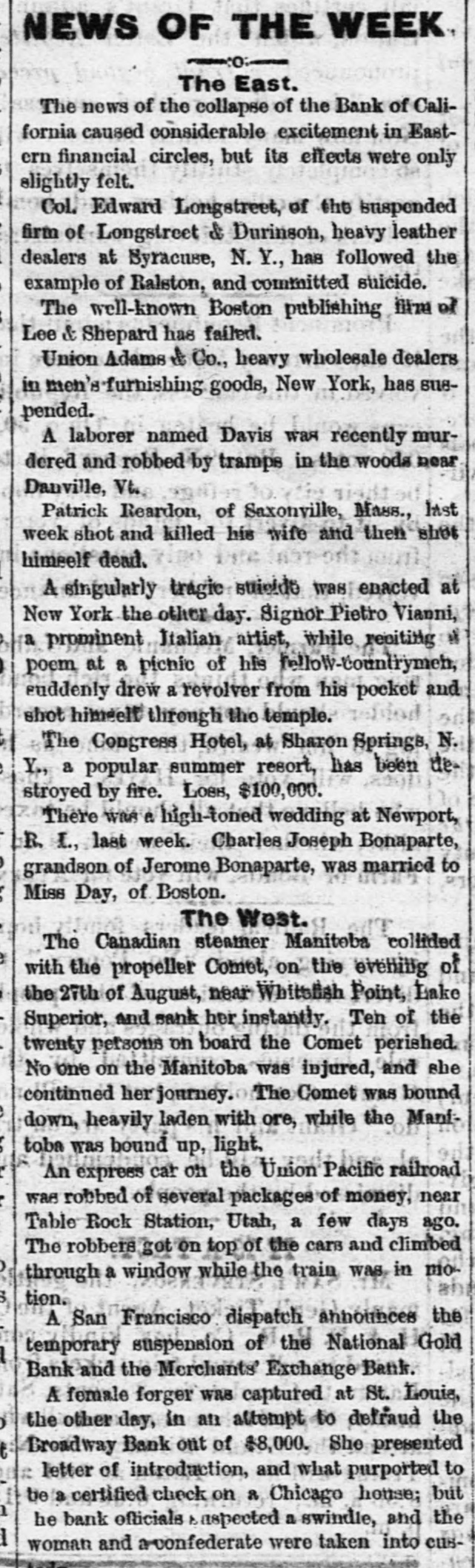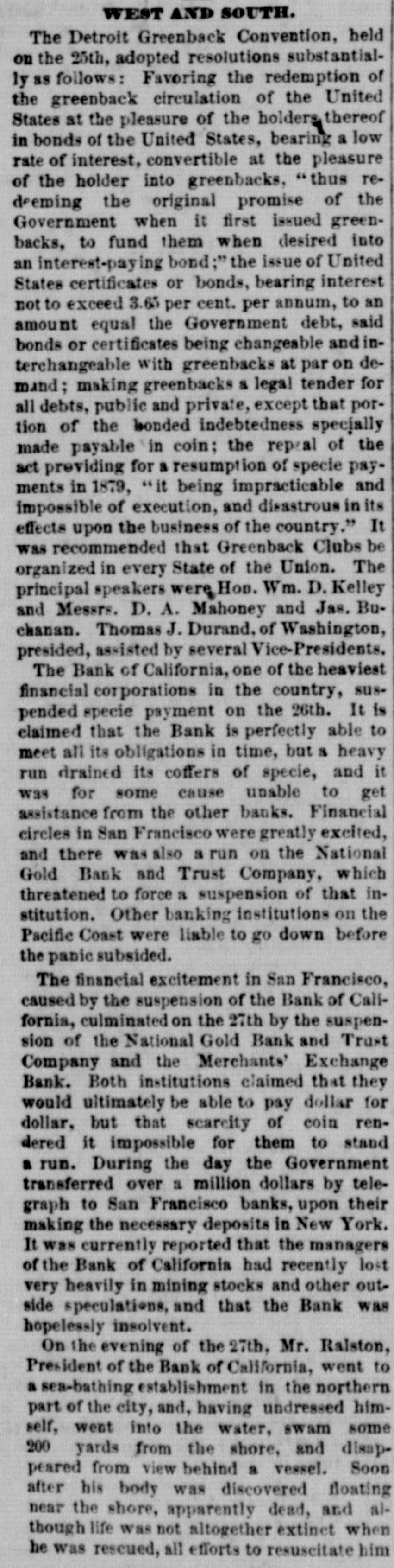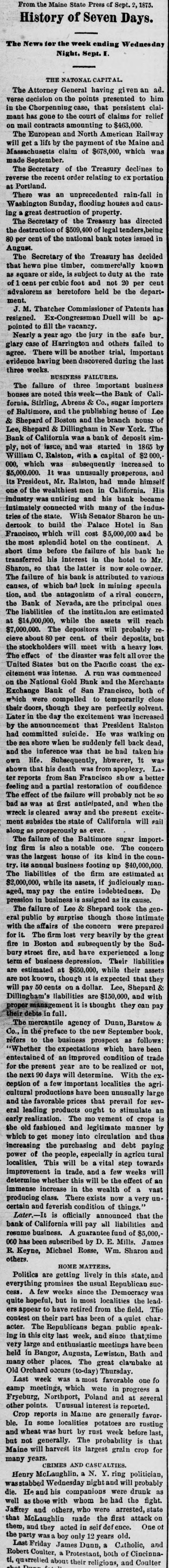 From the Maine State Press of Sept. 2, 1875. History of Seven Days. The News for the week ending Wednesday Night, Sept. I. THE NATONAL CAPIT The Attorney General having ven an ad. verse decision on the points presented to him in the Chorpenning case, that persistent claimant has gone to the court of claims for relief on mail contracts amounting to $463,000. The European and North American Railway will get a lift by the payment of the Maine and Massachusetts claim of $678,000, which was made September. The Secretary of the Treasury declines to reverse the recent order relating to ex portation at Portland. There was an unprecedented rain-fall in Washington Sunday, flooding houses and causing a great destruction of property. The Secretary of the Treasury has directed the destruction of $509, of legal tenders,being 80 per cent of the national bank notes issued in August. The Secretary of the Treasury has decided that hewn pine timber, commercially known as square or side, is subject to duty at the rate of cent per cubic foot and not 20 per cent advalorem as heretofore held be the department. J. M. Thatcher Commissioner of Patents has resigned. Ex-Congressman Duell will be appointed to fill the vacancy. Nearly a year ago the jury in the safe bur_ glary case of Harrington and others failed to agree. There will be another trial, important evidence having been discovered during the last three weeks. BUSINESS FAILURES. The failure of three important business houses are noted this week Bank of California, Stirling, Abrens & Co., sugar importers of Baltimore, and the publishing heuse of Lee & Shepard of Boston and the branch house of Lee, Shepard & Dillingham in New York. The Bank of California was bank of deposit simply, not of issue, and was started in 1865 by William C. Ralston, with capital of 000, 000, which was subsequently increased to $5,000.000. It was unusually prosperous, and its President, Mr. Ralston, had made himself one of the wealthiest men in California. His industry was untiring and his bank became intimately connected with many of the industries of the state. With Senator Sharon he undertook to build the Palace Hotel in San Francisco, which will cost $5,000,000 and be the most splendid hotel on the continent. A short time before the failure of his bank he transferred his interest in the hotel to Mr. Sharon, 80 that the latter is now sole owner. The failure of his bank is attributed to various causes, of which bad luck in mining specula tion, and the antagonism of a rival concern, the Bank of Nevada, are the principal ones The liabilities of the institution are estimated at $14,000,000, while the assets will reach $7,000,000. The depositors will probably recieve about 80 per cent. of their deposits, but the stockholders will meet with a heavy loss. The effect of the disaster was felt allover the United States but on the Pacific coast the excitement was intense. A run was commenced on the National Gold Bank and the Merchants Exchange Bank of San Francisco, both of which were compelled to temporarily close their doors, though they are perfectly solvent. Later in the day the excitement was increased by the announcement that President Ralston had committed suicide. He was walking on the sea shore when he suddenly fell back dead, and the inference was that he had taken his own life. Subsequently, however, it was shown that his death was from apoplexy. Later reports from San Francisco show better feeling and a partial restoration of confidence The effect of the failure will probably not be so bad as was at first anticipated, and when the wreck is cleared away and the present excitement subsides the state of California will sail along as prosperously as ever. The failure of the Baltimore sugar importing firm is also a notable one. The concern was the largest house of its kind in the country. its annual business footing up $40,000,000. The liabilities of the firm are estimated at $2,000,000, while its assets, if judiciously managed, may pay the entire indebtedness. De pression in business is assigned as its cause. The failure of Lee & Shepard took the general public by surprise though those intimate with the affairs of the concern were prepared for it. The firm lost very heavily by the great fire in Boston and subsequently by the Sudbury street fire, and have experienced long term of business depression. Their liabilities are estimated at $650,000, while their assets are not known, though it is expected that they will pay 50 cents on a dollar. Lee, Shepard & Dillingham's liabilities are $150,000, and with proper management it is thought they can pay their debts in full. The mercantile agency of Dunn, Barstow & Co., in the preface to the new September book, refers to the business prospect as follows: "Whether the expectations which have been entertained of an improved condition of trade for the present year are to be realized or not, the next 90 days will determine. With the exception of a few important localities the agricultural productions have been unusually large and the favorable prices that prevail for several leading products ought to stimulate an early realization. The mo vement of crops is the old fashioned and legitimate manner by which to get money into circulation and thus increasing the purchasing and debt paying power of the people, especially in agricu tural localities, This will be a vital step towards improvement in trade. and a few weeks will determine whether this will be the effect of an immense increase in the wealth of a vast producing class. There exists now a very uncertain and feverish condition of things. Later.-It is officially announced that the bank of California will pay all liabilities and resume business. A guarantee fund of $5,000,000 has been subscribed by D. E. Mills. James R. Keyne, Michael Rosse, Wm. Sharon and others. HOME MATTERS. Politics are getting lively in this state, and everything promises the usual Republican success. A few weeks since the De