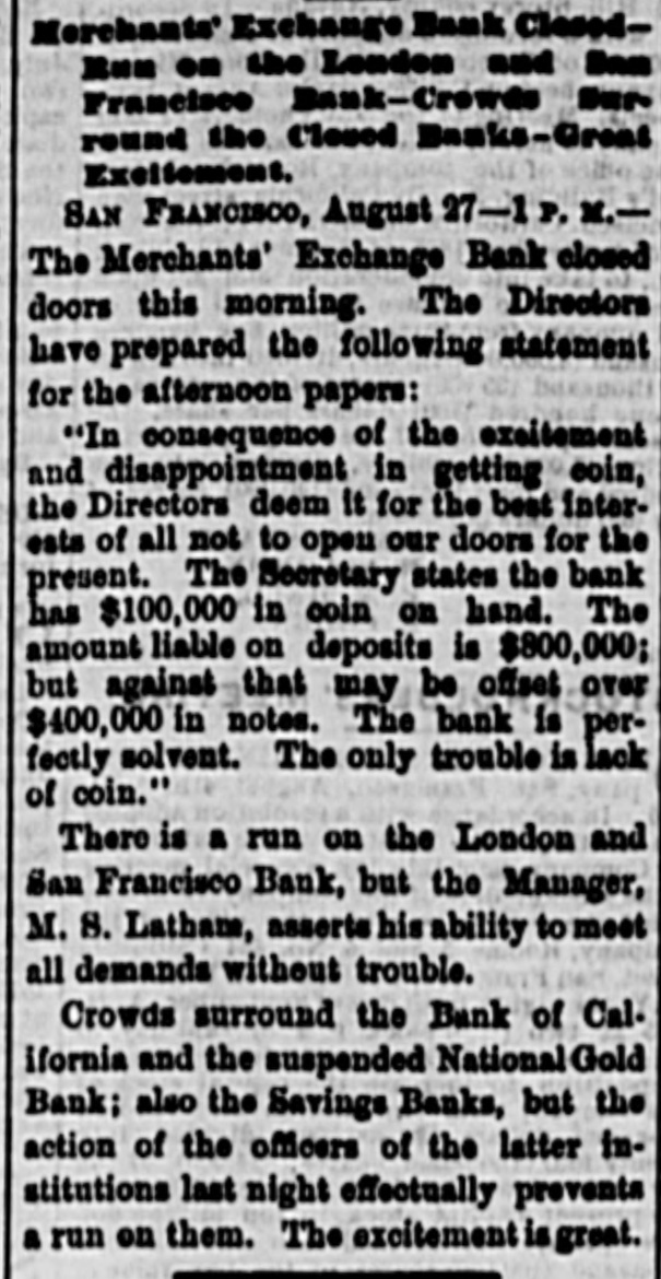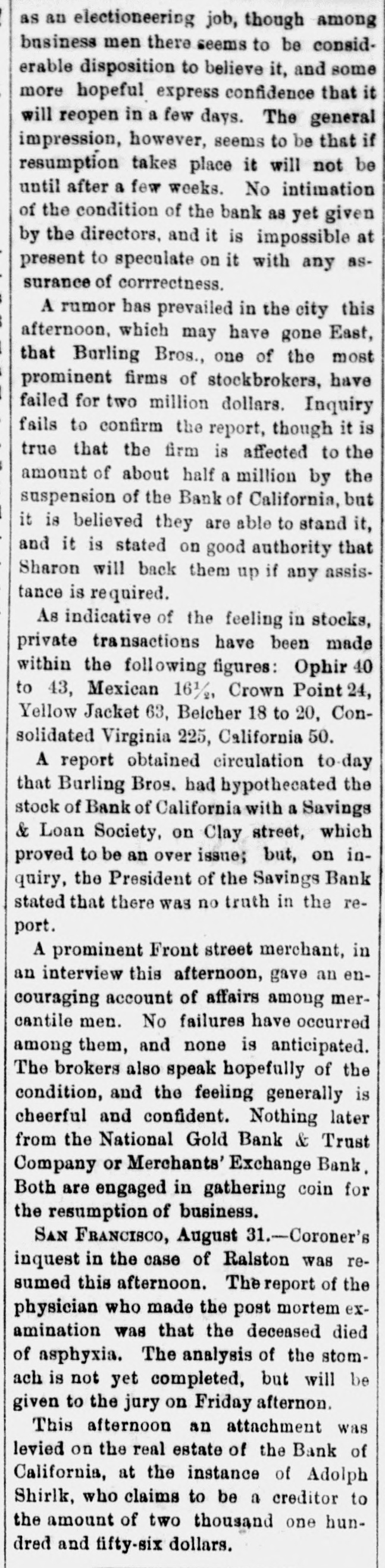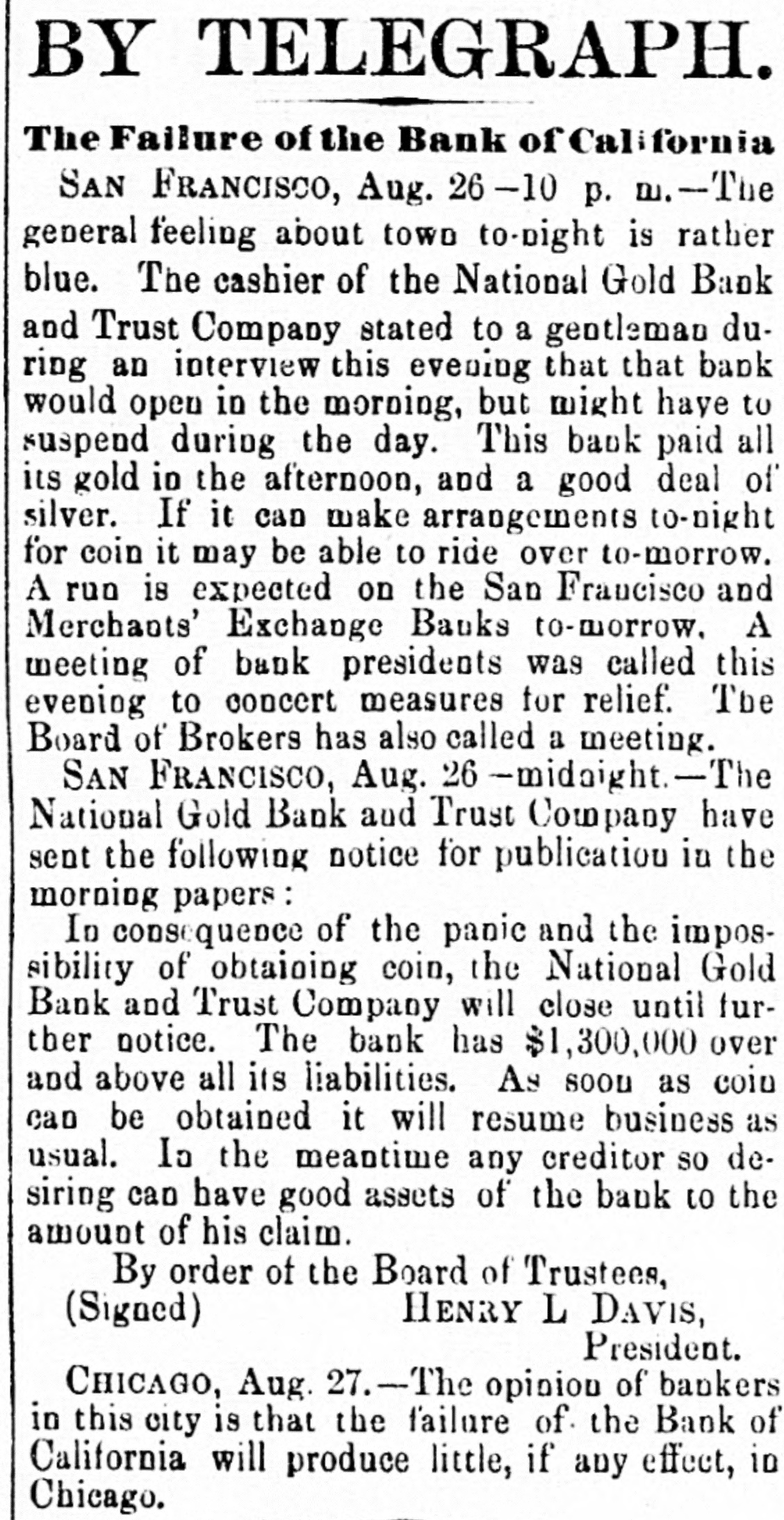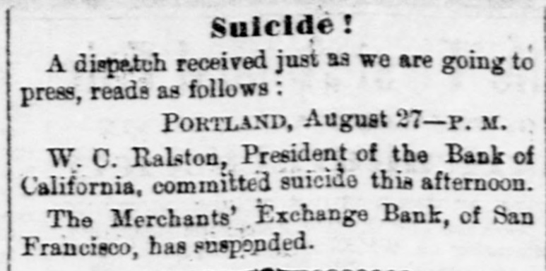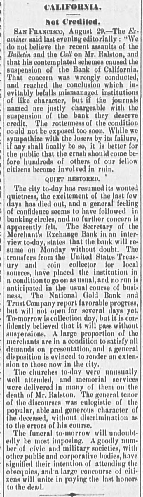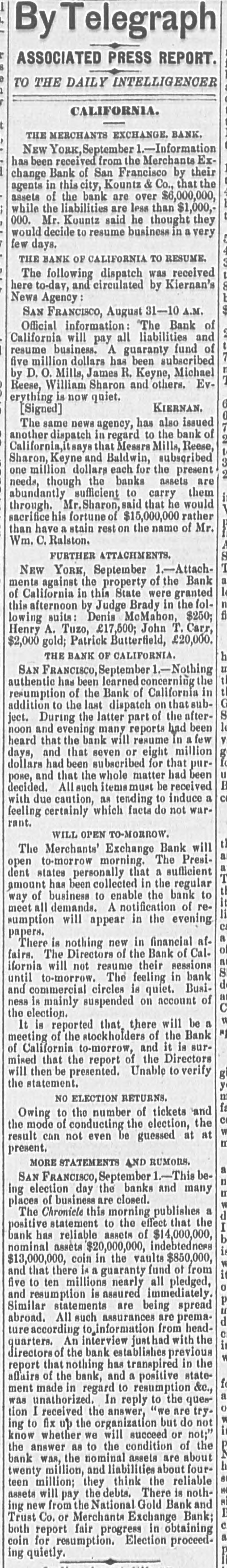 From the Maine State Press of Sept. 2, 1875. History of Seven Days. The News for the week ending Wednesday Night, Sept. I. THE NATONAL CAPIT The Attorney General having ven an ad. verse decision on the points presented to him in the Chorpenning case, that persistent claimant has gone to the court of claims for relief on mail contracts amounting to $463,000. The European and North American Railway will get a lift by the payment of the Maine and Massachusetts claim of $678,000, which was made September. The Secretary of the Treasury declines to reverse the recent order relating to ex portation at Portland. There was an unprecedented rain-fall in Washington Sunday, flooding houses and causing a great destruction of property. The Secretary of the Treasury has directed the destruction of $509, of legal tenders,being 80 per cent of the national bank notes issued in August. The Secretary of the Treasury has decided that hewn pine timber, commercially known as square or side, is subject to duty at the rate of cent per cubic foot and not 20 per cent advalorem as heretofore held be the department. J. M. Thatcher Commissioner of Patents has resigned. Ex-Congressman Duell will be appointed to fill the vacancy. Nearly a year ago the jury in the safe bur_ glary case of Harrington and others failed to agree. There will be another trial, important evidence having been discovered during the last three weeks. BUSINESS FAILURES. The failure of three important business houses are noted this week Bank of California, Stirling, Abrens & Co., sugar importers of Baltimore, and the publishing heuse of Lee & Shepard of Boston and the branch house of Lee, Shepard & Dillingham in New York. The Bank of California was bank of deposit simply, not of issue, and was started in 1865 by William C. Ralston, with capital of 000, 000, which was subsequently increased to $5,000.000. It was unusually prosperous, and its President, Mr. Ralston, had made himself one of the wealthiest men in California. His industry was untiring and his bank became intimately connected with many of the industries of the state. With Senator Sharon he undertook to build the Palace Hotel in San Francisco, which will cost $5,000,000 and be the most splendid hotel on the continent. A short time before the failure of his bank he transferred his interest in the hotel to Mr. Sharon, 80 that the latter is now sole owner. The failure of his bank is attributed to various causes, of which bad luck in mining specula tion, and the antagonism of a rival concern, the Bank of Nevada, are the principal ones The liabilities of the institution are estimated at $14,000,000, while the assets will reach $7,000,000. The depositors will probably recieve about 80 per cent. of their deposits, but the stockholders will meet with a heavy loss. The effect of the disaster was felt allover the United States but on the Pacific coast the excitement was intense. A run was commenced on the National Gold Bank and the Merchants Exchange Bank of San Francisco, both of which were compelled to temporarily close their doors, though they are perfectly solvent. Later in the day the excitement was increased by the announcement that President Ralston had committed suicide. He was walking on the sea shore when he suddenly fell back dead, and the inference was that he had taken his own life. Subsequently, however, it was shown that his death was from apoplexy. Later reports from San Francisco show better feeling and a partial restoration of confidence The effect of the failure will probably not be so bad as was at first anticipated, and when the wreck is cleared away and the present excitement subsides the state of California will sail along as prosperously as ever. The failure of the Baltimore sugar importing firm is also a notable one. The concern was the largest house of its kind in the country. its annual business footing up $40,000,000. The liabilities of the firm are estimated at $2,000,000, while its assets, if judiciously managed, may pay the entire indebtedness. De pression in business is assigned as its cause. The failure of Lee & Shepard took the general public by surprise though those intimate with the affairs of the concern were prepared for it. The firm lost very heavily by the great fire in Boston and subsequently by the Sudbury street fire, and have experienced long term of business depression. Their liabilities are estimated at $650,000, while their assets are not known, though it is expected that they will pay 50 cents on a dollar. Lee, Shepard & Dillingham's liabilities are $150,000, and with proper management it is thought they can pay their debts in full. The mercantile agency of Dunn, Barstow & Co., in the preface to the new September book, refers to the business prospect as follows: "Whether the expectations which have been entertained of an improved condition of trade for the present year are to be realized or not, the next 90 days will determine. With the exception of a few important localities the agricultural productions have been unusually large and the favorable prices that prevail for several leading products ought to stimulate an early realization. The mo vement of crops is the old fashioned and legitimate manner by which to get money into circulation and thus increasing the purchasing and debt paying power of the people, especially in agricu tural localities, This will be a vital step towards improvement in trade. and a few weeks will determine whether this will be the effect of an immense increase in the wealth of a vast producing class. There exists now a very uncertain and feverish condition of things. Later.-It is officially announced that the bank of California will pay all liabilities and resume business. A guarantee fund of $5,000,000 has been subscribed by D. E. Mills. James R. Keyne, Michael Rosse, Wm. Sharon and others. HOME MATTERS. Politics are getting lively in this state, and everything promises the usual Republican success. A few weeks since the De