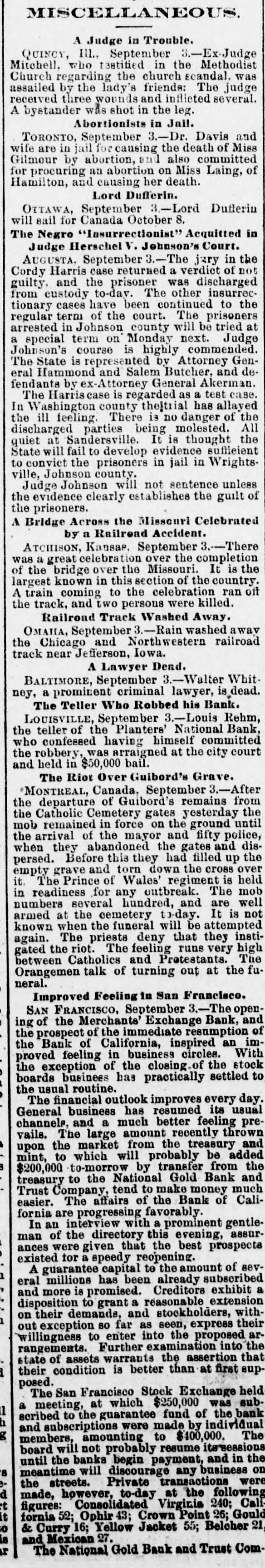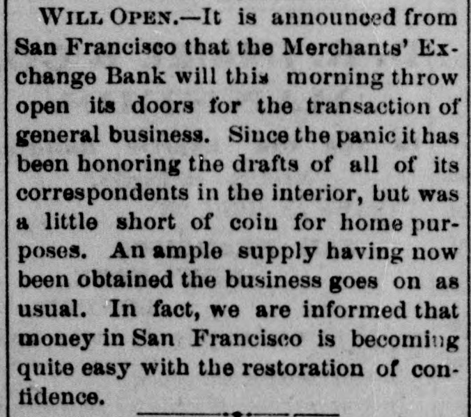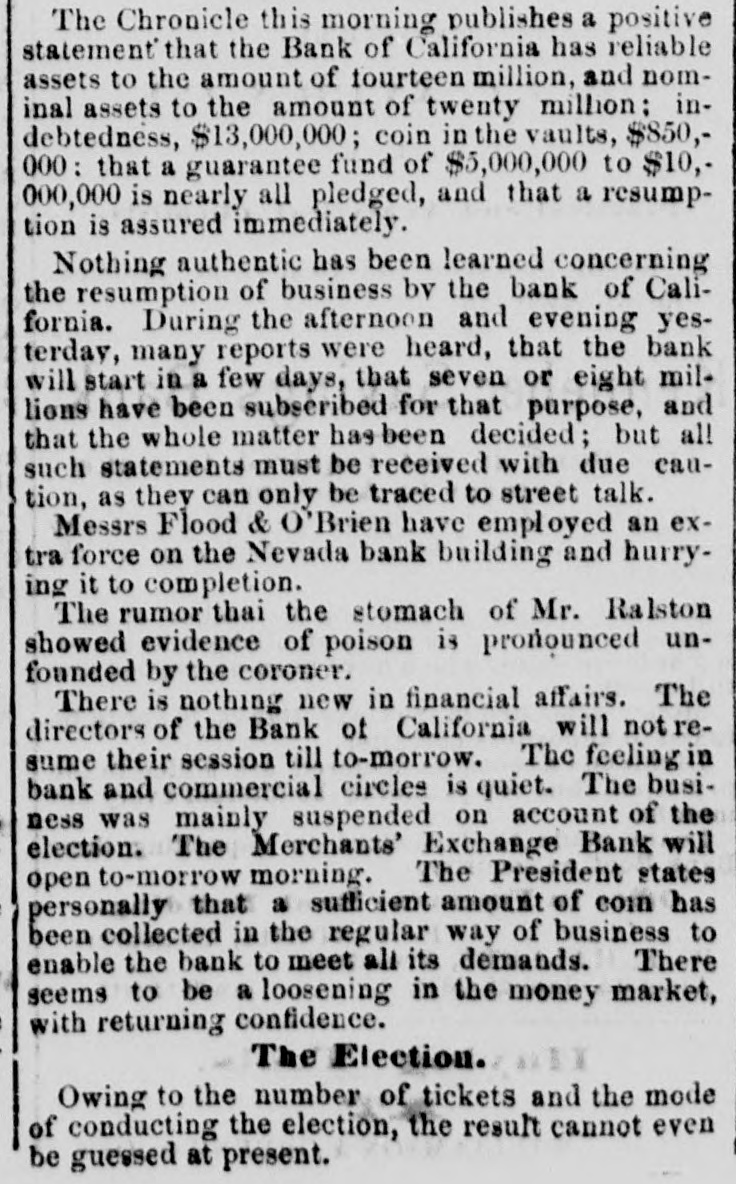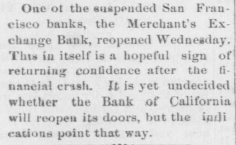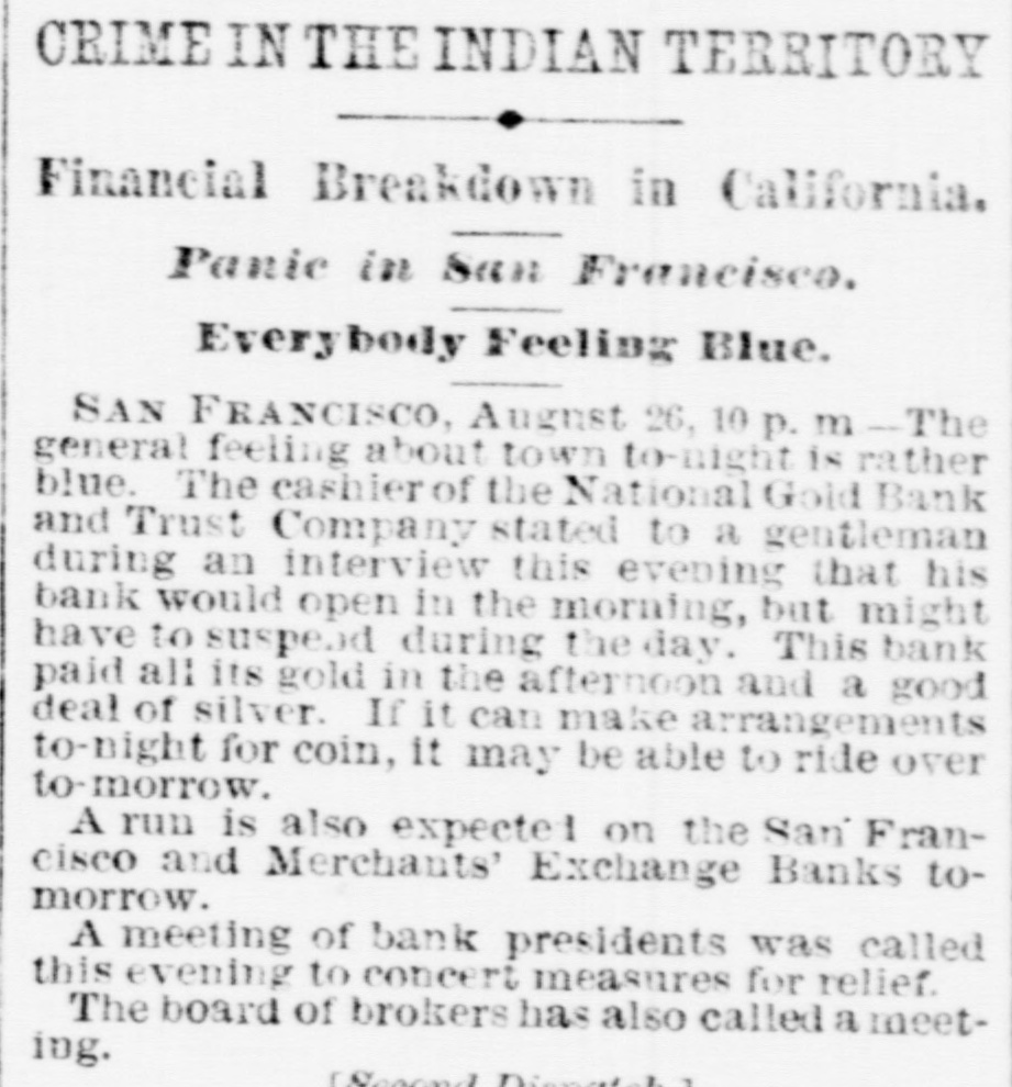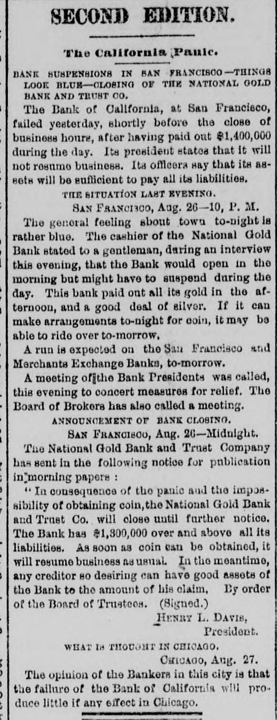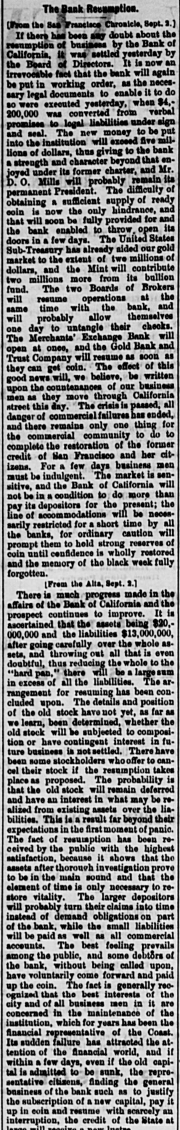 From the Maine State Press of Sept. 2, 1875. History of Seven Days. The News for the week ending Wednesday Night, Sept. I. THE NATONAL CAPIT The Attorney General having ven an ad. verse decision on the points presented to him in the Chorpenning case, that persistent claimant has gone to the court of claims for relief on mail contracts amounting to $463,000. The European and North American Railway will get a lift by the payment of the Maine and Massachusetts claim of $678,000, which was made September. The Secretary of the Treasury declines to reverse the recent order relating to ex portation at Portland. There was an unprecedented rain-fall in Washington Sunday, flooding houses and causing a great destruction of property. The Secretary of the Treasury has directed the destruction of $509, of legal tenders,being 80 per cent of the national bank notes issued in August. The Secretary of the Treasury has decided that hewn pine timber, commercially known as square or side, is subject to duty at the rate of cent per cubic foot and not 20 per cent advalorem as heretofore held be the department. J. M. Thatcher Commissioner of Patents has resigned. Ex-Congressman Duell will be appointed to fill the vacancy. Nearly a year ago the jury in the safe bur_ glary case of Harrington and others failed to agree. There will be another trial, important evidence having been discovered during the last three weeks. BUSINESS FAILURES. The failure of three important business houses are noted this week Bank of California, Stirling, Abrens & Co., sugar importers of Baltimore, and the publishing heuse of Lee & Shepard of Boston and the branch house of Lee, Shepard & Dillingham in New York. The Bank of California was bank of deposit simply, not of issue, and was started in 1865 by William C. Ralston, with capital of 000, 000, which was subsequently increased to $5,000.000. It was unusually prosperous, and its President, Mr. Ralston, had made himself one of the wealthiest men in California. His industry was untiring and his bank became intimately connected with many of the industries of the state. With Senator Sharon he undertook to build the Palace Hotel in San Francisco, which will cost $5,000,000 and be the most splendid hotel on the continent. A short time before the failure of his bank he transferred his interest in the hotel to Mr. Sharon, 80 that the latter is now sole owner. The failure of his bank is attributed to various causes, of which bad luck in mining specula tion, and the antagonism of a rival concern, the Bank of Nevada, are the principal ones The liabilities of the institution are estimated at $14,000,000, while the assets will reach $7,000,000. The depositors will probably recieve about 80 per cent. of their deposits, but the stockholders will meet with a heavy loss. The effect of the disaster was felt allover the United States but on the Pacific coast the excitement was intense. A run was commenced on the National Gold Bank and the Merchants Exchange Bank of San Francisco, both of which were compelled to temporarily close their doors, though they are perfectly solvent. Later in the day the excitement was increased by the announcement that President Ralston had committed suicide. He was walking on the sea shore when he suddenly fell back dead, and the inference was that he had taken his own life. Subsequently, however, it was shown that his death was from apoplexy. Later reports from San Francisco show better feeling and a partial restoration of confidence The effect of the failure will probably not be so bad as was at first anticipated, and when the wreck is cleared away and the present excitement subsides the state of California will sail along as prosperously as ever. The failure of the Baltimore sugar importing firm is also a notable one. The concern was the largest house of its kind in the country. its annual business footing up $40,000,000. The liabilities of the firm are estimated at $2,000,000, while its assets, if judiciously managed, may pay the entire indebtedness. De pression in business is assigned as its cause. The failure of Lee & Shepard took the general public by surprise though those intimate with the affairs of the concern were prepared for it. The firm lost very heavily by the great fire in Boston and subsequently by the Sudbury street fire, and have experienced long term of business depression. Their liabilities are estimated at $650,000, while their assets are not known, though it is expected that they will pay 50 cents on a dollar. Lee, Shepard & Dillingham's liabilities are $150,000, and with proper management it is thought they can pay their debts in full. The mercantile agency of Dunn, Barstow & Co., in the preface to the new September book, refers to the business prospect as follows: "Whether the expectations which have been entertained of an improved condition of trade for the present year are to be realized or not, the next 90 days will determine. With the exception of a few important localities the agricultural productions have been unusually large and the favorable prices that prevail for several leading products ought to stimulate an early realization. The mo vement of crops is the old fashioned and legitimate manner by which to get money into circulation and thus increasing the purchasing and debt paying power of the people, especially in agricu tural localities, This will be a vital step towards improvement in trade. and a few weeks will determine whether this will be the effect of an immense increase in the wealth of a vast producing class. There exists now a very uncertain and feverish condition of things. Later.-It is officially announced that the bank of California will pay all liabilities and resume business. A guarantee fund of $5,000,000 has been subscribed by D. E. Mills. James R. Keyne, Michael Rosse, Wm. Sharon and others. HOME MATTERS. Politics are getting lively in this state, and everything promises the usual Republican success. A few weeks since the De