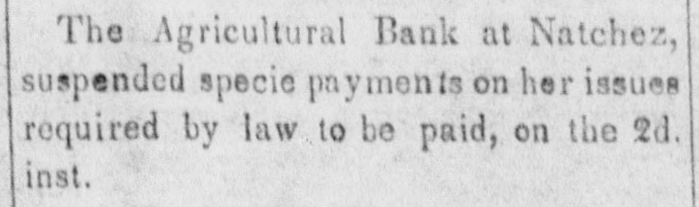 The Agricultural Bank at Natchez, suspended specie payments on her issues required by law to be paid, on the 2d. inst.