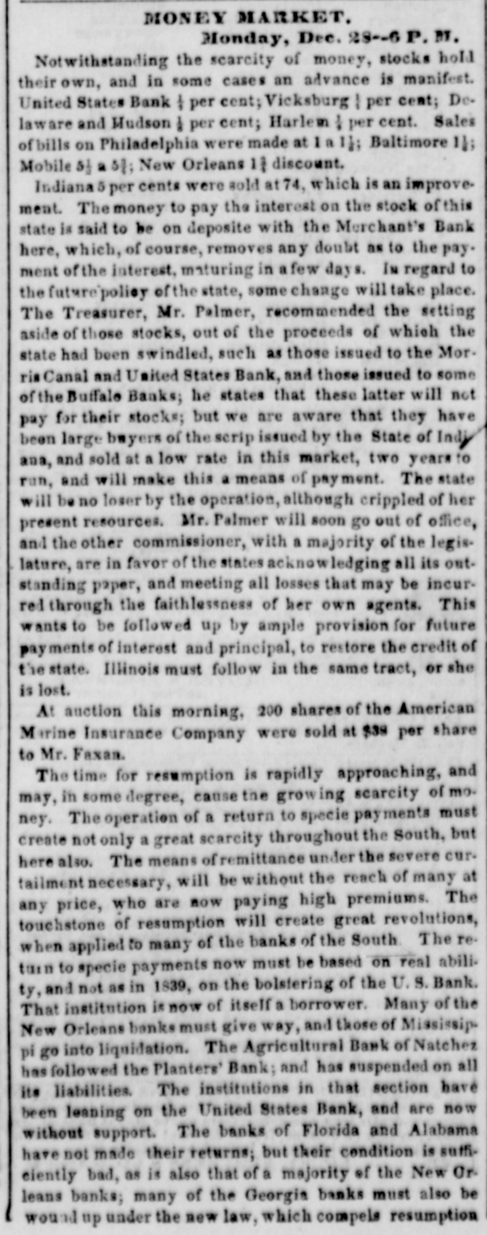 MONEY MARKET. Monday, Dec. 28--6 P. BT. Notwithstanding the scarcity of money, stocks hold their own, and in some cases an advance is manifest. United States Bank 1 per cent; Vicksburg I per cent; De. laware and Mudson I per cent; Harlem 1 per cent. Sales of bills on Philadelphia were made at 1}; Baltimore 11; Mobile 51 a 51; New Orleans 11 discount. Indiana per cents were sold at 74, which is an improvement. The money to pay the interest on the stock of this state is said to be on deposite with the Merchant's Bank here, which, of course, removes any doubt as to the pay. ment of the interest. maturing in a few days. IN regard to the future'poliey of the state, some change will take place. The Treasurer, Mr. Palmer, recommended the setting aside of those stocks, out of the proceeds of which the state had been swindled, such as those issued to the Mor. ris Canal and United States Bank, and those issued to some of the Buffale Banks; he states that these latter will not pay for their stocks; but we are aware that they have been large bayers of the scrip issued by the State of Indi ana, and sold at a low rate in this market, two years to run, and will make this a means of payment. The state will be no loser by the operation, although crippled of her present resources. Mr. Palmer will soon go out of office, and the other commissioner, with a majority of the legislature, are in favor of the states acknow ledging all its outstanding paper, and meeting all losses that may be incur. red through the faithlessness of her own agents. This wants to be followed up by ample provision for future payments of interest and principal, to restore the credit of the state. Illinois must follow in the same tract, or she is lost. At auction this morning, 200 shares of the American M irine Insurance Company were sold at $39 per share to Mr. Faxan. The time for resumption is rapidly approaching, and may, in some degree, cause the growing scarcity of money. The operation of a return to specie payments must create not only a great scarcity throughout the South, but here also The means of remittance under the severe curtailment necessary, will be without the reach of many at any price, who are now paying high premiums. The touchstone of resumption will create great revolutions, when applied to many of the banks of the South The retain to specie payments now must be based on real ability, and not as in 1839, on the bolstering of the U.S. Bank. That institution is now of itself a borrower. Many of the New Orleans banks must give way, and those of Mississippi go into liquidation. The Agricultural Bank of Natchez has followed the Planters' Bank; and has suspended on all its liabilities. The institutions in that section have been leaning on the United States Bank, and are now without support. The banks of Florida and Alabama have not made their returns; but their condition is sufficiently bad, as is also that of a majority of the New Or. leans banks; many of the Georgia banks must also be wound up under the new law, which compels resumption
