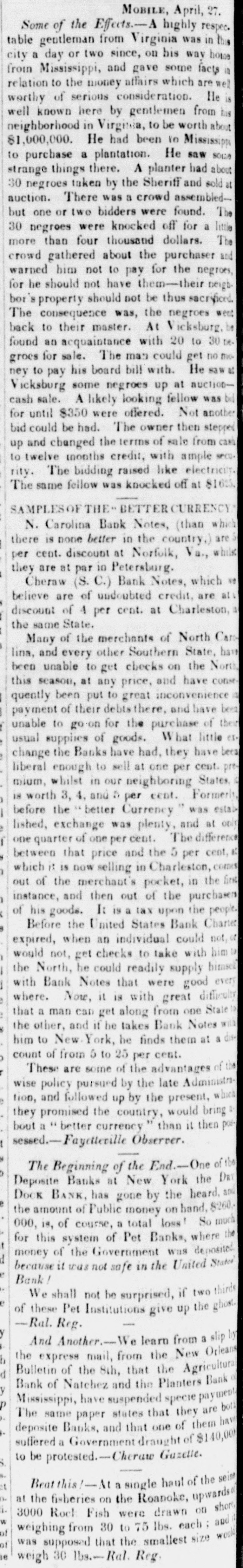 MOBILE,April,27 Some of the Effects.-A highly respec. table gentleman from Virginia was city a day or two since, on his way home from Mississippi, and gave some facts to the money affairs which are wel of serious relation worthy consideration. well here by gentlemen his in Virginia, to He had in neighborhood 81,000,000. known been be He worth about Mississippi from He is to purchase a plantation. saw social strange things there. A planter had about 30 negroes taken by the Sheriff and sold auction. There was a crowd assembledbut one or two bidders were found. The 30 negrees were knocked off for a little more than four thousand dollars. The crowd gathered about the purchaser and warned him not to pay for the negroes, he them-their for should not have height bor's should not be thus sacrificed The was, property consequence the negroes went back to their master. At Vicksburg, found an acquaintance with 20 to 30 D groce for sale. The man could get to his board bill with. sawa some negroes up at ney Vicksburg pay He auctioncash sale. A likely looking fellow was for until $350 were offered. Not another be had. The owner then stepped and the terms of cash bid up could changed sale from secu to months credit, with ample The bidding raised rity. twelve like off electricity $16.5 The same fellow was knocked at SAMPLESOFTHE-BETTERCURRENCY Bank Notes, (than whi N. Carolina is country.) there none better in the are discount at Va., while are at in per they cent. par Petersburg. Norfulk, Cheraw (S. C.) Bank Notes, which believe are of undoubted credit, are at discount of 4 per cent. at Charleston, the same State. Many of the merchants of North Card lina, and every other Southern State, have to get checks on this at any price, been put to great of their debtsthere, quently been season, unable inconvenience and and have the have of North conse bees unable to for the the payment go.on purchase What little usual supplies of goods. change the Banks have had, they have liberal enough to sell at one per cent. mium, whilst in our neighboring States is worth 3, 4. and a per cent. Formerly before the better Currency was estal lished, exchange was plenty, and at opi one of one per cent. that and the 5 per between quarter price The difference cent, which it is now selling in Charleston, come out of the merchant's pocket, in the and then out of the purchases of his It is a tax upon instance, goods. the Charter people Before the United States Bank expired, when an individual could not, would not, get checks to take with him the North, he could readily supply himsel with Bank Notes that were good every it is with great difficult where. Now, from State that a man can get along one the and if he takes to he finds a him other, New York, Bank them Notes at count of from 5 to 25 per cent. These are some of the advantages of wise policy pursued by the late Administra tion, and followed up by the present, which they promised the country, would bring bout a " better currency than it then sessed.-Fayetterille Observer. The Beginning of the End.-One of the Banks at New York the Dock BANK, has gone by the Deposite heard. 8260. the amount of Public money on hand, 000, is, of course, a total loss So much for this system of Pet Banks, where the ₫ money of the Government was deposited States because it was not safe in the United Bank We shall not be surprised, if two thirds of these Pet Institutions give up the ghost -Ral. Reg. y And Another.-We learn from a slip b the mail, from the New Orlean of the 8th, that the d of Natchez and the y Bank Bulletin express Planters Agricultural payment Bank Mississippi, have suspended specie both The same paper states that they are have deposite Banks, and that one of them suffered a Government draught of $140,00 to be protested.-Cheraw Gazette. ct Beat this!-Ata single haul of the seim at the fisheries on the Roanoke, i. Fish were drawn on 3000 Roel each upwards shore and of weighing from 30 to 75 lbs. ; WOUR was supposed that the smallest size weigh Ral. Reg