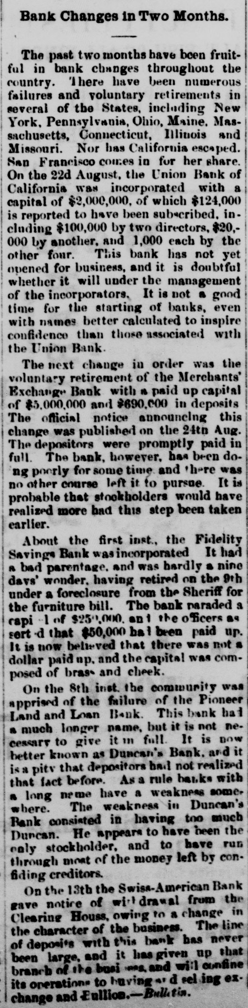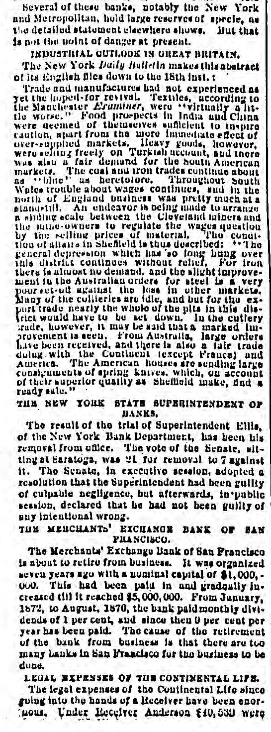 Porter also made addresses. Gov. Young, of Ohio, made the closing speech. THE notes stolen from the Keesville. E Y., National bank have been returned. The money and bonds are retained by the robbers. FRED W. COFFIN & Wm. Roscoe Lyon, E paper dealers on Beekman street, failed on the 27th; liabilities $102,000; assets $119,000. THE new Edison telephone was tested a New York on the 26th inst., over the extra ordinary distance of 240 miles. Music was , transmitted distinctly. , THE New York Domocratic state convention is called to meet at the Delavan House, P Albany, on the 11th of September. THE British Rifle Team arrived in New f York city on the 25th inst., and were accord1 ed a hearty reception. THE WEST. $ THE government of the Mormon church has passed into the hands of the 12 apostles, ten of whom were present at the funeral of Brigham Young on the 2d inst. Two of them : James Smith and Orson Pratt are in Eng$ land and it is not likely there will be another president of the church appointed for some time. THE Iowa state prohibition convention, at Oskaloosa, on the 31st ult., nominated Hon. Elias Jessup, of Oskaloosa, for gover: nor. It made no other nominations. THE authorities of the Cineinnati, Hamilton and Dayton railroad have issued a circular to their employes, declaring that on and after Sept. 1, 90 miles run shall consti tute a day's work. Heretofore 60 miles has counted as a full day. Much dissatisfaction is expressed by the employes that no increase of pay accompanies the increased labor. THE Lawrence and Southwestern railroad, extending from Lawrence, Ks., to Carbondale, Osage county, 38 miles, was sold, on the 29th, pursuant to a decree of the Circuit Court of the United States. It was bid off by Robert C. Carr, of St. Louis, for himself and associates for the sum of $48,335. The road was built seven year ago at a cost of about $16,000 per mile. Mr. Carr is president of the Kansas Pacific railroad company. Whether it is bought in the interest of that company is not known. THE Illinois State Savings institution, at Chicago, made an assignment to Abner Taylor, on the 26th. This bank has been established some 20 years, and from the prestige of its early reputation has secured the patronage of a great majority of the poorer classes, who deposit in saving institutions here. The failure will fall with crushing weight on these people, many of whom have invested their all with that bank. BEN DE BAR manager of De Bar's Opera House, St. Louis died in that city on the 28th. THE Indians attacked a party of settlers at Grizer Basin, Montana, on the 24th, killing seven men. On the 26th they met another party of whitesand killed nine of them. IT is thought that a Howe truss can be thrown over the break in the railway bridge at Council Bluffs. If it can be done trains will be running over the structure inside of four months. THE Merchants' Exchange Bank of San Francisco, on the 25th, announced that it would go into liquidation. The concern is perfectly solvent, and will pay dollar for dollar. A PARTY of twenty persons who left Deadwood, a few weeks since, en route for the Little Missouri river, returned on the 25th. They report having been attacked by the Indians on the 21st inst. Thos. H. Carr, quartz recorder of the Deadwood mining district, was killed. Twenty-seven horses belonging to the miners were also killed.
