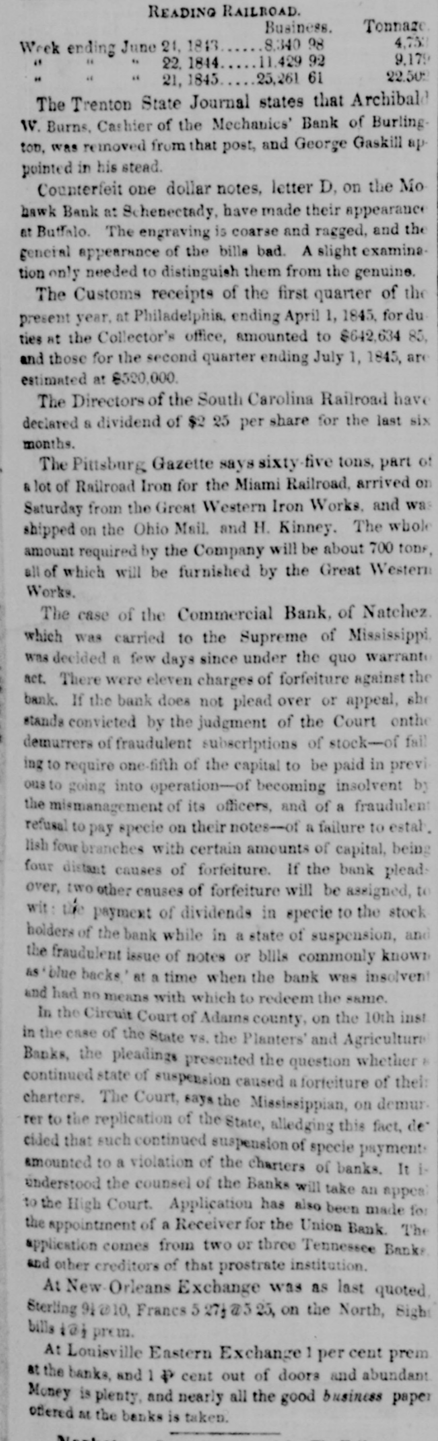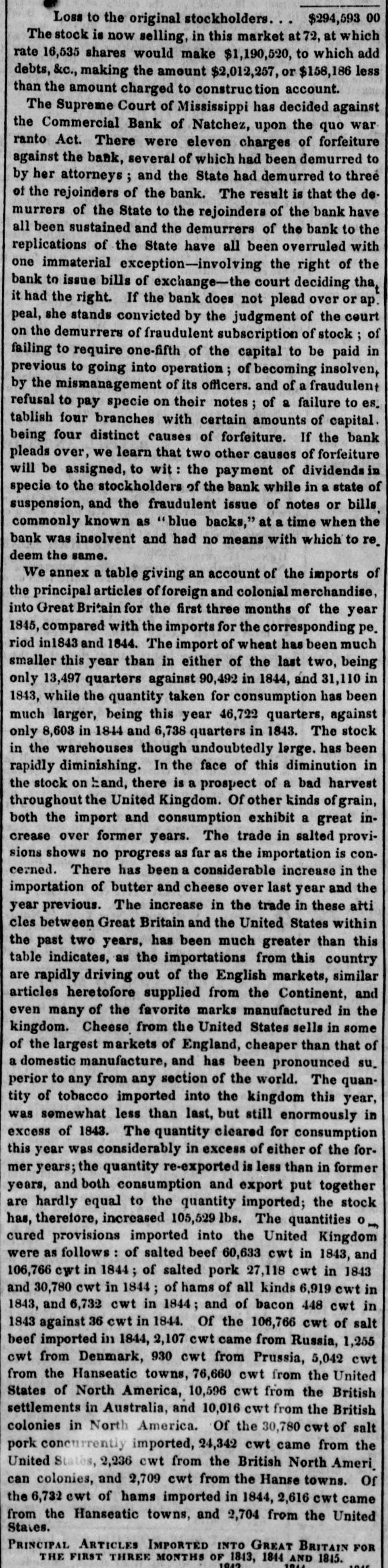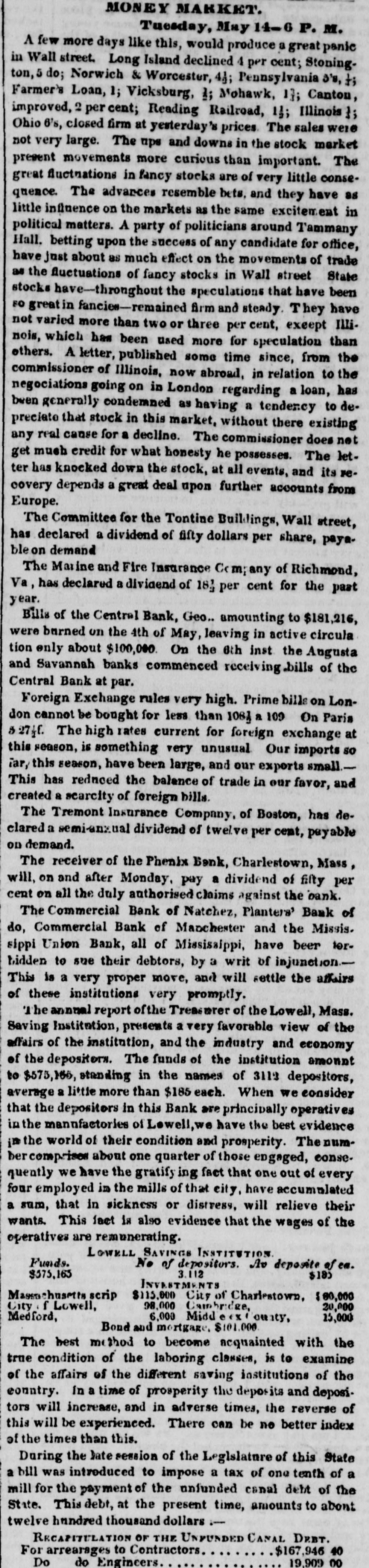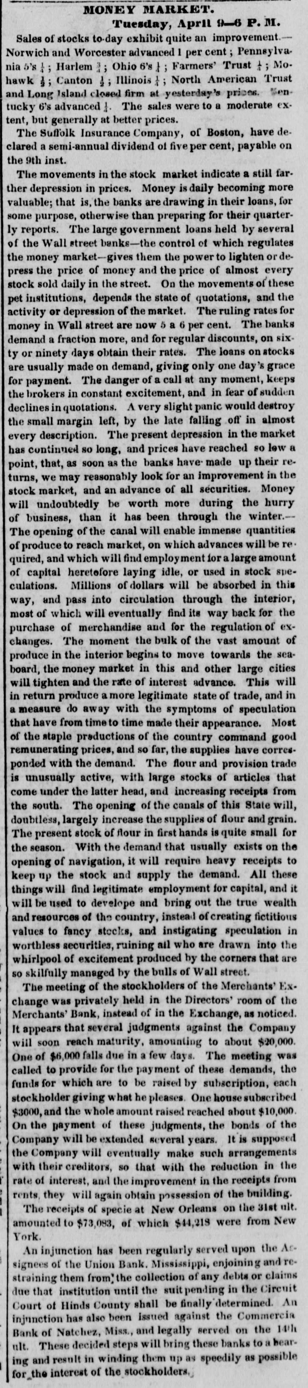 MONEY MARKET. Tuesday, April 9-6 P. M. Sales of stocks to-day exhibit quite an improvement. Norwich and Worcester advanced 1 per cent; Pennsylvania 5's Harlem Ohio 6's Farmers' Trust 1; Mohawk 1; Canton 1; Illinois North American Trust and Long Island closed firm at yesterday's prices. Sentucky 6's advanced 1. The sales were to a moderate extent, but generally at better prices. The Suffolk Insurance Company, of Boston, have declared a semi-annual dividend of five per cent, payable on the 9th inst. The movements in the stock market indicate a still farther depression in prices. Money is daily becoming more valuable; that is, the banks are drawing in their loans, for some purpose, otherwise than preparing for their quarterly reports. The large government loans held by several of the Wall street banks-the control of which regulates the money market-gives them the power to lighten or depress the price of money and the price of almost every stock sold daily in the street. On the movements of these pet institutions, depends the state of quotations, and the activity or depression of the market. The ruling rates for money in Wall street are now 5 a 6 per cent. The banks demand a fraction more, and for regular discounts, on sixty or ninety days obtain their rates. The loans on stocks are usually made on demand, giving only one day's grace for payment. The danger of a call at any moment, keeps the brokers in constant excitement, and in fear of sudden declines in quotations. A very slight panic would destroy the small margin left, by the late falling off in almost every description. The present depression in the market has continued so long, and prices have reached so low a point, that, as soon as the banks have made up their returns, we may reasonably look for an improvement in the stock market, and an advance of all securities. Money will undoubtedly be worth more during the hurry of business, than it has been through the winter.-The opening of the canal will enable immense quantities of to reach market, on which advances will be re. and which will find employment for a quired, produce used in large stock amount of capital heretofore laying idle, or speculations. Millions of dollars will be absorbed in this way, and pass into circulation through the interior, most of which will eventually find its way back for the purchase of merchandise and for the regulation of exchanges. The moment the bulk of the vast amount of produce in the interior begins to move towards the seaboard, the money market in this and other large cities will tighten and the rate of interest advance. This will in return produce a more legitimate state of trade, and in a measure do away with the symptoms of speculation that have from time to time made their appearance. Most of the staple productions of the country command good remunerating prices, and so far, the supplies have corresponded with the demand. The flour and provision trade is unusually active, with large stocks of articles that come under the latter head, and increasing receipts from the south. The opening of the canals of this State will, doubtless, largely increase the supplies of flour and grain. The present stock of flour in first hands is quite small for the season. With the demand that usually exists on the opening of navigation, it will require heavy receipts to keep up the stock and supply the demand. All these things will find legitimate employment for capital, and it will be used to develope and bring out the true wealth and resources of the country, instead of creating fictitious values to fancy stocks, and instigating speculation in worthless securities, ruining all who are drawn into the whirlpool of excitement produced by the corners that are so by the skilfully managed bulls of Wall street. The meeting of the stockholders of the Merchants' Exchange was privately held in the Directors' room of the Merchants' Bank, instead of in the Exchange, as noticed. It appears that several judgments against the Company will soon reach maturity, amounting to about $20,000. One of $6,000 falls due in a few days. The meeting was called to provide for the payment of these demands, the funds for which are to be raised by subscription, each stockholder giving what he pleases. One house subscribed $3000, and the whole amount raised reached about $10,000. On the payment of these judgments, the bonds of the Company will be extended several years. It is supposed the Company will eventually make such arrangements with their creditors, so that with the reduction in the rate of interest, and the improvement in the receipts from rents, they will again obtain possession of the building. The receipts of specie at New Orleans on the 31st ult. amounted to $73,083, of which $44,218 were from New York. An injunction has been regularly served upon the Assignees of the Union Bank. Mississippi, enjoining and restraining them from) the collection of any debts or claims due that institution until the suit pending in the Circuit Court of Hinds County shall be finally determined. An has also been issued against the Commercia Miss., and legally served on decided steps will bring these a ult. injunction Bank These of Natchez, banks to the bear- 14th ing and result in winding them up as speedily as possible for the interest of the stockholders.