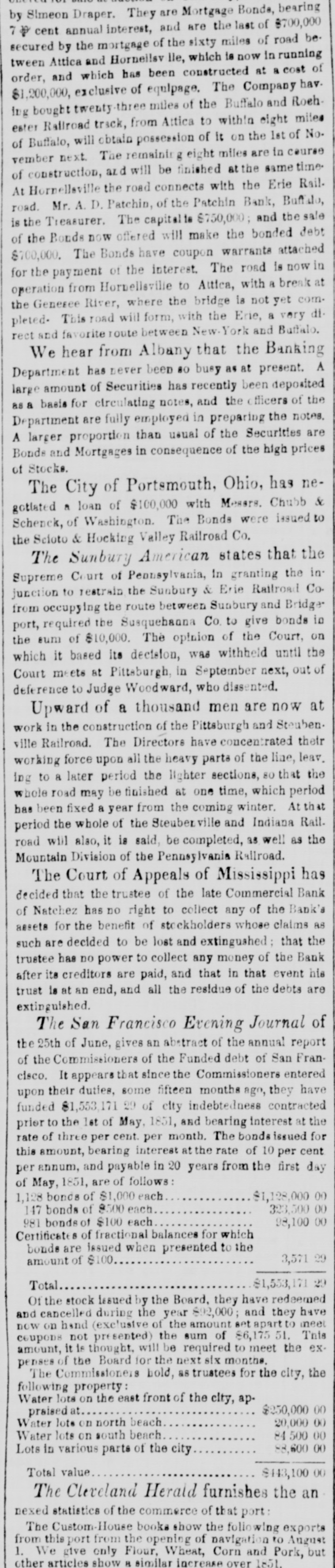 by Slmeon Draper. They are Mortgage Bonds, bearing cent annual interest, and are the last of $700,000 secured by the mortgage of the sixty miles of road be. tween Attica and Hornellsv lle, which is now in running order, and which has been constructed at a cost of $1,200,000, exclusive of equlpage. The Company hav. ing bought twenty-three miles of the Buffalo and Roeh. track, from Attica to within will obtain it on ester of Buffalo, Ratiroad possession of the eight 1st of miles No. vember next. The remaining eight miles are in course of construction, and will be finished at the same time. At Hornelleville the road connects with the Erie Rail. road. Mr. A. D. Patchin, of the Patchin Bank, Buffalo, is the Treasurer. The capitalia $750,000; and the sale of the Bonds now offered will make the bonded debt $700,000. The Bonds have coupon warrants attached for the payment of the interest. The road is now in operation from Hornellsville to Attica, with a break at the Generee River, where the bridge is not yet completed. This road will form, with the Erie, a very direct and favorite route between New-York and Buffalo. We hear from Albany that the Banking Department has never been 80 busy as at present. A large amount of Securities has recently been deposited as basis for circulating notes, and the officers of the Department are fully employed in preparing the notes. A larger proportion than usual of the Securities are Bonds and Mortgages in consequence of the high prices of Stocks. The City of Portsmouth, Ohio, has negotlated a loan of $100,000 with Messrs. Chubb & Schenck, of Washington. The Bonds were issued to the Scloto & Hocking Valley Railroad Co. The Sunbury American states that the Supreme Court of Pennsylvania, in granting the injunction to restrain the Sunbury & Erie Rattroad Co. from occupying the route between Sumbury and Bridge port, required the Susquehanna Co. to give bonds in the sum of $10,000. The opinion of the Court, on which it based its decision, was withheld until the Court meets at Pittaburgh, in September next, out of deference to Judge Woodward, who dissented. Upward of a thousand men are now at work in the construction of the Pittsburgh and Steuben. ville Railroad. The Directors have concentrated their working force upon all the heavy parta of the line, leav. ing to a later period the lighter sections, 80 that the whole road may be finished at one time, which period has been fixed a year from the coming winter. At that period the whole of the Steuberville and Indiana Rail. road will also, it is said, be completed, 35 well as the Mountain Division of the Pennsylvania Rallroad. The Court of Appeals of Mississippi has decided that the trustee of the late Commercial Bank of Natchez has no right to collect any of the Bank's assets for the benefit of stockholders whose claims as such are decided to be lost and extingushed ; that the trustee has no power to collect any money of the Bank after its creditors are paid, and that in that event his trust is at an end, and all the residue of the debts are extinguished. The San Francisco Evening Journal of the 25th of June, gives an abstract of the annual report of the Commissioners of the Funded debt of San Francisco. It appears that since the Commissioners entered upon their duties, some fifteen months ago, they have funded $1,553,171 29 of city indebtedness contracted prior to the 1st of May, 1851, and bearing interest at the rate of three per cent. per month. The bondsissued for this amount, bearing interest at the rate of 10 per cent per annum, and payable in 20 years from the first day of May, 1851, are of follows: $1,128,000 00 1,128 bonds of $1,000 each 323,500 00 147 bonds of $500 each 981 bonds of $100 each 98,100 00 Certificates of fractional balances for which bonds are issued when presented to the 3,571.29 amount of $100 $1,533,171.29 Total Of the stock issued by the Board, they have redeemed and cancelled during the year 892,000; and they have now on hand (exclusive of the amount set tapart to meet coupons not presented) the sum of 86,175 51. This amount, it Is thought. will be required to meet the expenses of the Board for the next six months. The Commissioners bold, as trustees for the city, the following property: Water lots on the east front of the city, ap$250,000 00 praised Water lote on north beach 20,000 00 Water lots on south beach 84 500 00 88,600 00 Lots in various parts of the city Total value $143,100 00 The Cleveland Herald furnishes the an nexed statistics of the commerce of that port: The Custom-House books show the following exports from this port from the opening of navigation to August 1. We give only Flour, Wheat, Corn and Pork, but other articles show H similar increase over 1851.
