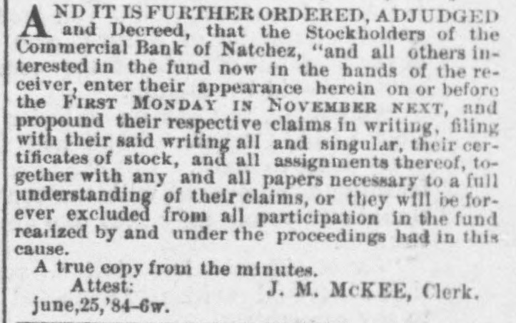 ND IT IS FURTHER ORDERED, ADJUDGED A and Decreed, that the Stockholders of the Commercial Bank of Natchez, "and all others interested in the fund now in the hands of the receiver, enter their appearance herein on or before the FIRST Monday IN NOVEMBER NEXT, and propound their respective claims in writing, filing with their said writing all and singular, their certificates of stock, and all assignments thereof, together with any and all papers necessary to a full understanding of their claims, or they will be forever excluded from all participation in the fund readized by and under the proceedings had in this cause. A true copy from the minutes. Attest: J. M. McKEE, Clerk. june,25,'84-6w.