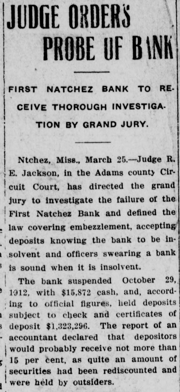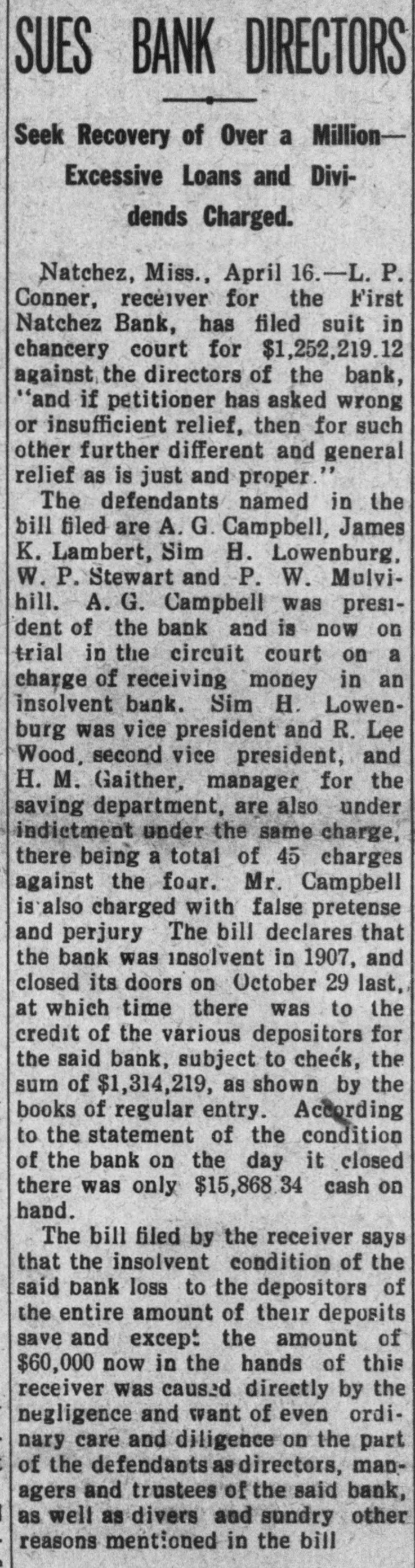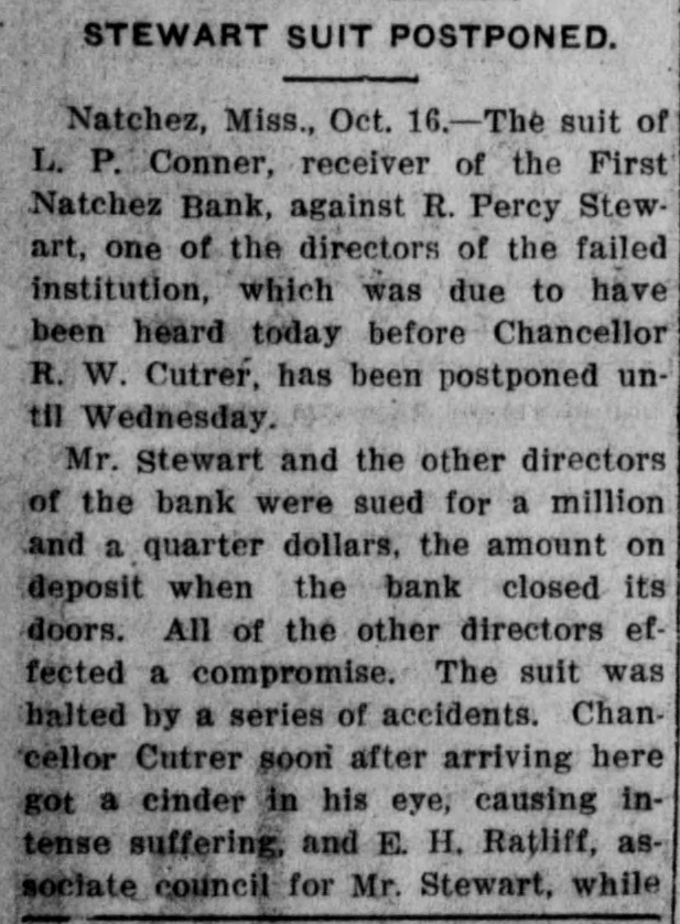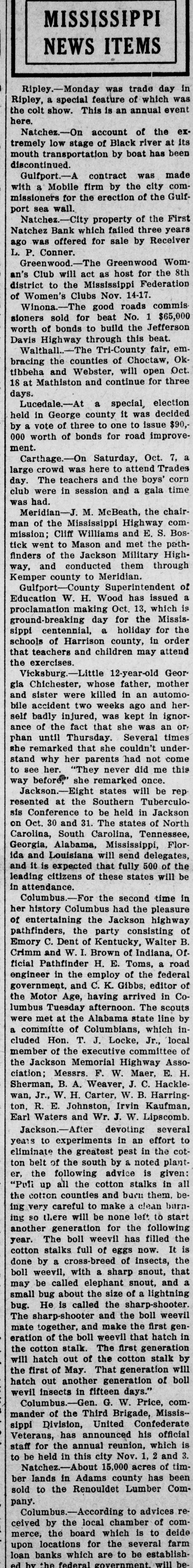 MISSISSIPPI NEWS ITEMS Ripley.-Monday was trade day in Ripley, a special feature of which was the colt show. This is an annual event here. Natchez.-On account of the extremely low stage of Black river at its mouth transportation by boat has been discontinued. Gulfport.-A contract was made with a Mobile firm by the city commissioners for the erection of the Gulfport sea wall. Natchez.-City property of the First Natchez Bank which failed three years ago was offered for sale by Receiver L. P. Conner. Greenwood.-The Greenwood Woman's Club will act as host for the 8th district to the Mississippi Federation of Women's Clubs Nov. 14-17. Winona.-The good roads commissioners sold for beat No. 1 $65,000 worth of bonds to build the Jefferson Davis Highway through this beat. Walthall.-The Tri-County fair, embracing the counties of Choctaw, Oktibbeha and Webster, will open Oct. 18 at Mathiston and continue for three days. Lucedale.-At a special, election held in George county it was decided by a vote of three to one to issue $90,000 worth of bonds for road improvement. Carthage.-On Saturday, Oct. 7, a large crowd was here to attend Trades day. The teachers and the boys' corn club were in session and a gala time was had. Meridian-J. M. McBeath, the chairman of the Mississippi Highway commission; Cliff Williams and E. S. Bostick went to Mason and met the pathfinders of the Jackson Military Highway, and conducted them through Kemper county to Meridian. Gulfport-County Superintendent of Education W. H. Wood has issued a proclamation making Oct. 13, which is ground-breaking day for the Mississippi centennial, a holiday for the schools of Harrison county, in order that teachers and children may attend the exercises. Vicksburg.-Little 12-year-old Georgia Chichester, whose father, mother and sister were killed in an automobile accident two weeks ago and herself badly injured, was kept in ignorance of the fact that she was an or. phan until Thursday. Several times she remarked that she couldn't understand why her parents had not come to see her. "They never did me this way before," she remarked once. Jackson.-Eight states will be rep resented at the Southern Tuberculosis Conference to be held in Jackson on Oct. 30 and 31. The states of North Carolina, South Carolina, Tennessee, Georgia, Alabama, Mississippi, Florida and Louisiana will send delegates, and it is expected that fully 500 of the leading citizens of these states will be in attendance. Columbus.-For the second time in her history Columbus had the pleasure of entertaining the Jackson highway pathfinders, the party consisting of Emory C. Dent of Kentucky, Walter B. Crimm and W. I. Brown of Indiana, Official Pathfinder H. E. Toms, a road engineer in the employ of the federal government, and C. K. Gibbs, editor of the Motor Age, having arrived in Columbus Tuesday afternoon. The scouts were met at the Alabama state line by a committe of Columbians, which included Hon. T. J. Locke, Jr., local member of the executive committee of the Jackson Memorial Highway Association; Messrs. F. W. Maer, E. H. Sherman, B. A. Weaver, J. C. Hacklewan, Jr., W. H. Carter, W. B. Harrington, R. E. Johnston, Irvin Kaufman, Earl Waters and Wr. J. W. Lipscomb. Jackson.-After devoting several years to experiments in an effort to eliminate the greatest pest in the cotton belt of the south by a noted planter, the following advice is given: "Puli up all the cotton stalks in all the cotton counties and back them, being very careful to make a clean burning so there will be none left to start another generation for the following year. The boll weevil has filled the cotton stalks full of eggs now. It is done by a cross-breed of insects, the boll weevil, with a sharp snout, that may be called elephant snout, and a small bug about the size of a lightning bug. He is called the sharp-shooter. The sharp-shooter and the boll weevil mate together, and make the first generation of the boll weevil that hatch in the cotton stalk. The first generation will hatch out of the cotton stalk by the first of May. That generation will hatch out another generation of boll wevil insects in fifteen days." Columbus.-Gen. G. W. Price, commander of the Third Brigade, Missis--