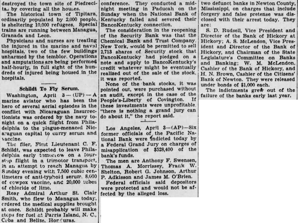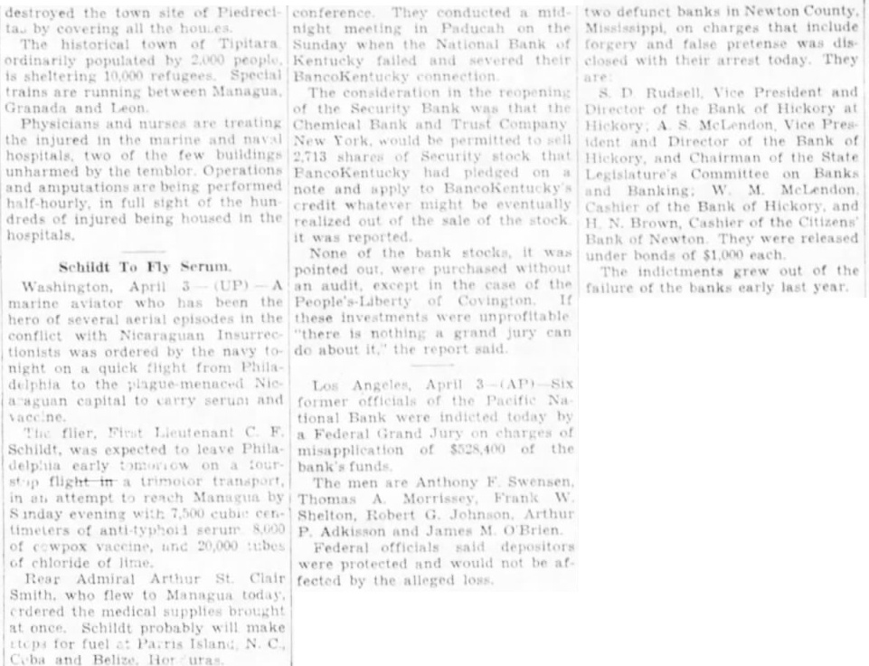 destroyed the town site of Piedrecita., by covering all the houses. The historical town of Tipitara, ordinarily populated by 2,000 people, is sheltering 10,000 refugees. Special trains are running between Managua, Granada and Leon. Physicians and nurses are treating the injured in the marine and naval hospitals. two of the few buildings unharmed by the temblor. Operations and amputations are being performed half-hourly, in full sight of the hundreds of injured being housed in the hospitals. Schildt To Fly Serum. Washington, April (UP) marine aviator who has been the hero of several aerial episodes in the conflict with Nicaraguan Insurrectionists was ordered by the navy tonight on quick flight from Philadelphia to the plague-menaced Nicaraguan capital to carry serum and vaccine. The flier, First Lieutenant C. F. Schildt, was expected to leave Philadelphia early tomorrow on fourstop flight in a trimotor transport, in at. attempt to reach Managua by Sunday evening with 7,500 cuble centimeters of anti-typhoid serum. 8,000 cowpox vaccine, and 20,000 tubes of chloride of lime. Rear Admiral Arthur St. Clair Smith, who flew to Managua today, ordered the medical supplies brought at once. Schildt probably will make stops for fuel at Parris Island, N. C., Cuba and Belize. Horduras. conference. They conducted a midnight meeting in Paducah on the Sunday when the National Bank of Kentucky failed and severed their BancoKentucky The consideration in the reopening of the Security Bank was that the Chemical Bank and Trust Company, New York, would be permitted to sell 2,713 shares of Security stock that PancoKentucky had pledged on note apply to BancoKentucky's credit whatever might be eventually realized out of the sale of the stock. it was reported. None of the bank stocks, it was pointed out, were purchased without an audit, except in the case of the People's-Liberty of Covington. If these investments were unprofitable "there is nothing grand jury can do about it," the report said. Los Angeles, April 3-(AP)-Six former officials of the Pacific National Bank were indicted today by Federal Grand Jury charges of misapplication of $528,400 of the bank's funds. The men are Anthony F. Swensen, Thomas Morrissey, Frank W. Shelton, Robert G. Johnson, Arthur P. Adkisson and James M. O'Brien. Federal officials said depositors were and would not be affected by the alleged loss. two defunct banks in Newton County, Mississippi, on charges that include forgery false pretense was disclosed with their arrest today. They are: S. D. Rudsell, Vice President and Director of the Bank of Hickory at Hickory; A. S. McLendon, Vice President and Director of the Bank of Hickory, and Chairman of the State Legislature's Committee on Banks and Banking: W. M. McLendon, Cashier of the Bank of Hickory, and H. N. Brown, Cashier of the Citizens' Bank of Newton. They were released under bonds of $1,000 each. The indictments grew out of the failure of the banks early last year.