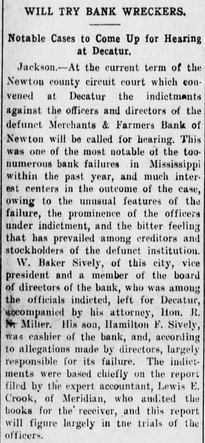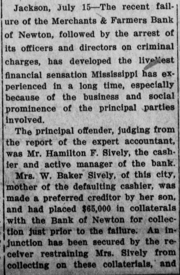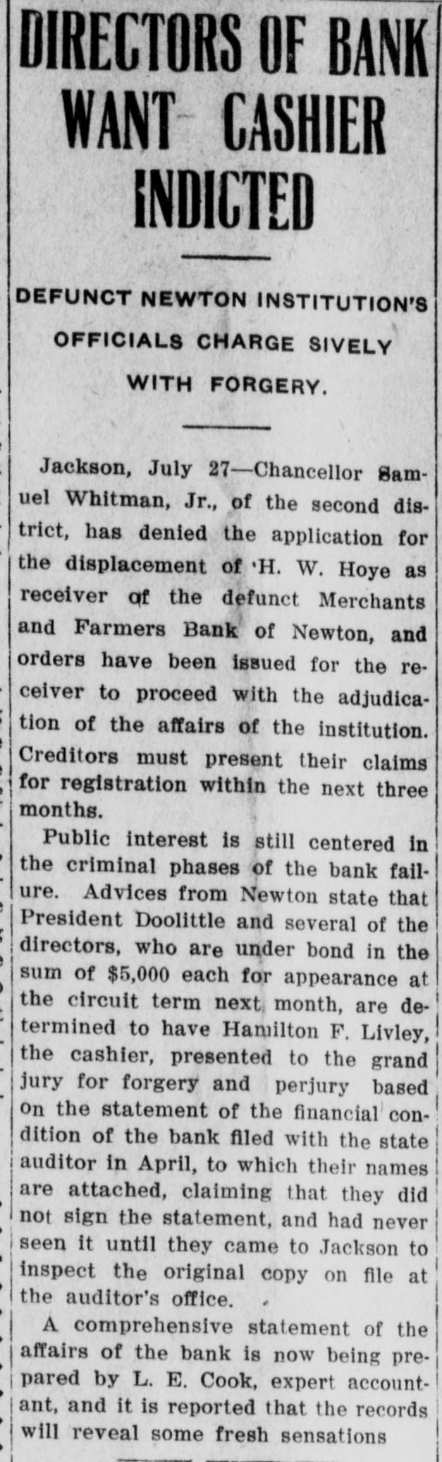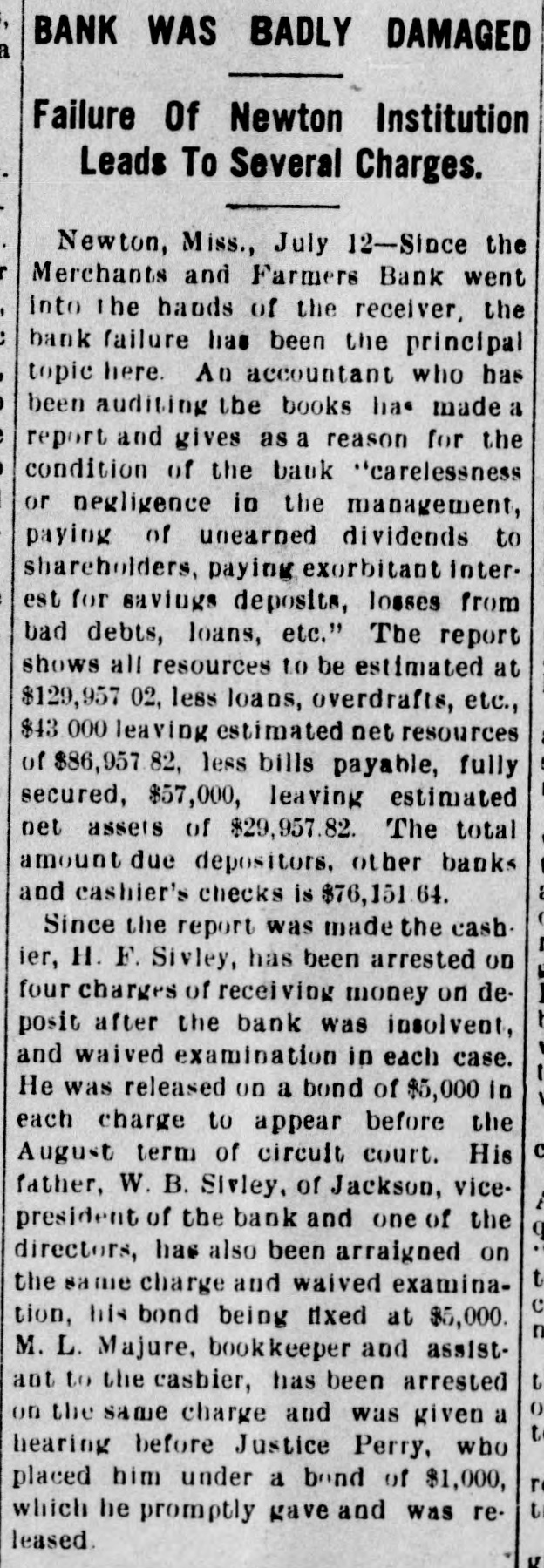BANK WAS BADLY DAMAGED Failure Of Newton Institution Leads To Several Charges. Newton, Miss., July 12-Since the Merchants and Farmers Bank went into the hands of the receiver, the bank failure has been the principal topic here. An accountant who has been auditing the books has made a report and gives as a reason for the condition of the bauk "carelessness or negligence in the management, paying of unearned dividends to shareholders, paying exorbitant Interest for savings deposits, losses from bad debts, loans, etc." The report shows all resources to be estimated at $129,957 02, less loans, overdrafts, etc., $43.000 leaving estimated net resources of $86,957.82, less bills payable, fully secured, $57,000, leaving estimated net assets of $29,957.82. The total amount due depositors, other bank< and cashier's checks is $76,151.64. Since the report was made the cashier, H. F. Sivley, has been arrested on four charges of receiving money on deposit after the bank was insolvent, and waived examination in each case. He was released on a bond of $5,000 in each charge to appear before the August term of circuit court. His father, W. B. Sivley, of Jackson, vicepresident of the bank and one of the directors, has also been arraigned on the same charge and waived examination, his bond being fixed at $5,000. M. L. Majure, bookkeeper and assistant to the casbier, has been arrested on the same charge and was given a hearing before Justice Perry, who placed him under a bond of $1,000, which he promptly gave and was released.