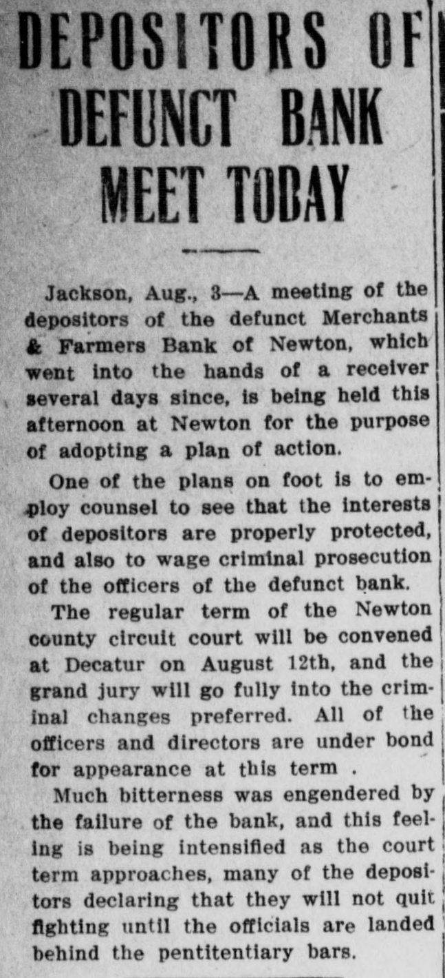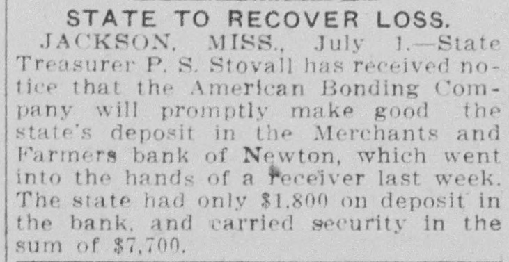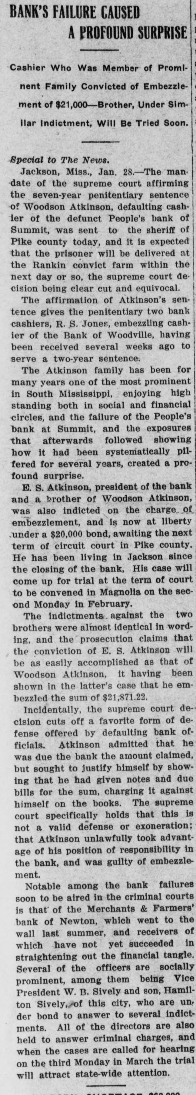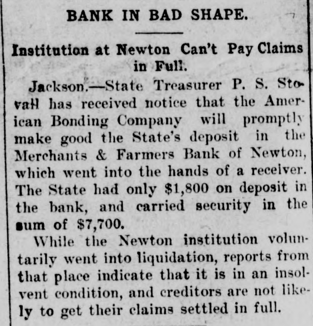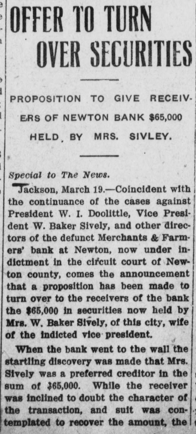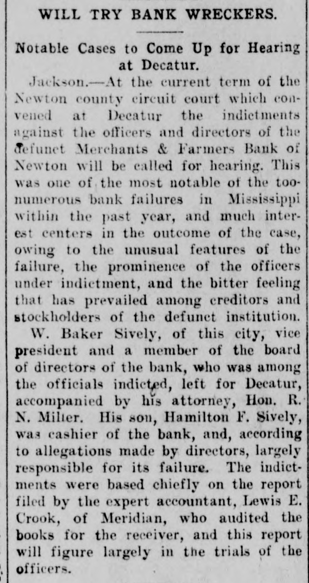 BANK WAS BADLY DAMAGED Failure Of Newton Institution Leads To Several Charges. Newton, Miss., July 12-Since the Merchants and Farmers Bank went into the hands of the receiver, the bank failure has been the principal topic here. An accountant who has been auditing the books has made a report and gives as a reason for the condition of the bauk "carelessness or negligence in the management, paying of unearned dividends to shareholders, paying exorbitant Interest for savings deposits, losses from bad debts, loans, etc." The report shows all resources to be estimated at $129,957 02, less loans, overdrafts, etc., $43.000 leaving estimated net resources of $86,957.82, less bills payable, fully secured, $57,000, leaving estimated net assets of $29,957.82. The total amount due depositors, other bank< and cashier's checks is $76,151.64. Since the report was made the cashier, H. F. Sivley, has been arrested on four charges of receiving money on deposit after the bank was insolvent, and waived examination in each case. He was released on a bond of $5,000 in each charge to appear before the August term of circuit court. His father, W. B. Sivley, of Jackson, vicepresident of the bank and one of the directors, has also been arraigned on the same charge and waived examination, his bond being fixed at $5,000. M. L. Majure, bookkeeper and assistant to the casbier, has been arrested on the same charge and was given a hearing before Justice Perry, who placed him under a bond of $1,000, which he promptly gave and was released.