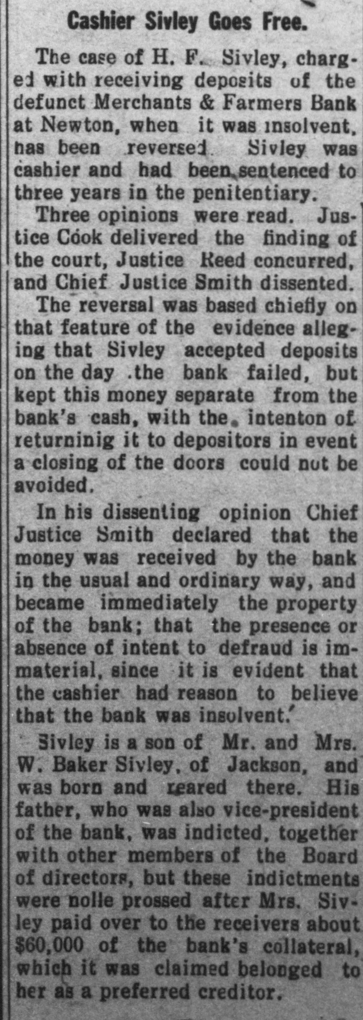 Cashier Sivley Goes Free. The case of H. F. Sivley, charged with receiving deposits of the defunct Merchants & Farmers Bank at Newton, when it was insolvent, has been reversed Sivley was cashier and had been, sentenced to three years in the penitentiary. Three opinions were read. Justice Cook delivered the finding of the court, Justice Reed concurred, and Chief Justice Smith dissented. The reversal was based chiefly on that feature of the evidence alleging that Sivley accepted deposits on the day .the bank failed, but kept this money separate from the bank's cash, with the. intenton of returning it to depositors in event a closing of the doors could not be avoided. In his dissenting opinion Chief Justice Smith declared that the money was received by the bank in the usual and ordinary way, and became immediately the property of the bank; that the presence or absence of intent to defraud is immaterial, since it is evident that the cashier had reason to believe that the bank was insolvent." Sivley is a son of Mr. and Mrs. W. Baker Sivley, of Jackson, and was born and reared there. His father, who was also vice-president of the bank, was indicted, together with other members of the Board of directors, but these indictments were nolle prossed after Mrs. Sivley paid over to the receivers about $60,000 of the bank's collateral, which it was claimed belonged to her as a preferred creditor.