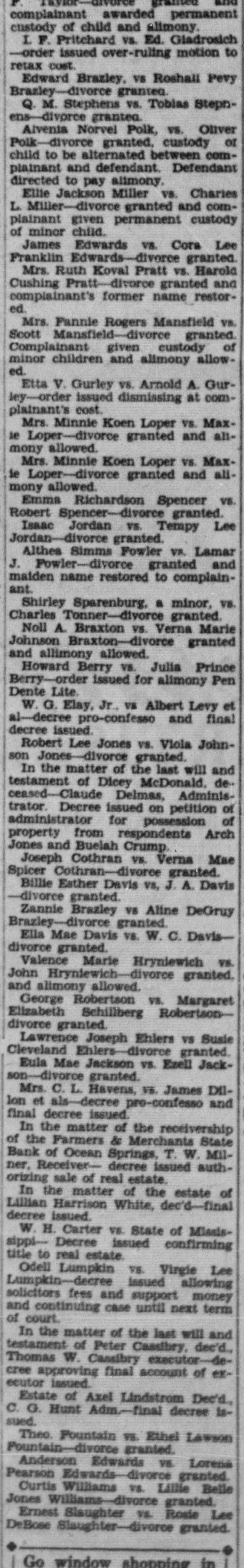 complainant awarded permanent custody of child and alimony. L F. Pritchard vs. Ed. Giadrosich -order issued over-ruling motion to retax cust. Edward Brazley, vs Roshall Pevy Brazley-divorce granted. Q. M. Stephens vs. Toblas Stepnens-divorce granted. Alvenia Norvel Polk, vs. Oliver Polk-divorce granted, custody of child to be alternated between complainant and defendant. Defendant directed to pay alimony. Ellie Jackson Miller vs. Charies L. Miller-divorce granted and complainant given permanent custody of minor child. James Edwards vs. Cora Lee Franklin Edwards-divorce granted. Mrs. Ruth Koval Pratt vs. Harold Cushing Pratt-divorce granted and complainant's former name restored. Mrs. Fannie Rogers Mansfield va. Scott Mansfield-divorce granted. Complainant given custody of minor children and alimony allowed. Etta V. Gurley VS. Arnold A. Gurley-order issued dismissing at complainant's cost. Mrs. Minnie Koen Loper vs. Maxle Loper-divorce granted and allmony allowed. Mrs. Minnie Koen Loper vs. Maxle Loper-divorce granted and allmony allowed. Emma Richardson Spencer vs. Robert Spencer-divorce granted. Isaac Jordan vs. Tempy Lee Jordan-divorce granted. Althea Simms Fowler VA. Lamar J. Fowler-divorce granted and maiden name restored to complainant. Shirley Sparenburg, a minor, vs. Charles Tonner-divorce granted. Noll A. Braxton vs. Verna Marie Johnson Braxton-divorce granted and allimony allowed. Howard Berry vs. Julia Prince Berry-order issued for alimony Pen Dente Lite. W. G. Elay, Jr., vs Albert Levy et al-decree pro-confesso and final decree issued. Robert Lee Jones vs. Viola Johnson Jones-divorce granted. In the matter of the last will and testament of Dicey McDonald. deceased-Claude Delmas, Administrator. Decree issued on petition of administrator for possession of property from respondents Arch Jones and Buelah Crump Joseph Cothran VS. Verna Mae Spicer Cothran-divorce granted. Billie Eather Davis vs, J. A. Davis -divorce granted. Zannie Brazley vs Aline DeGruy Brazley-divorce granted. Ella Mae Davis va. W. C. Davisdivorce granted. Valence Marie Hryniewich vs. John Hryniewich-divorce granted. and alimony allowed. George Robertson vs. Margaret Elizabeth Schillberg Robertsondivorce granted. Lawrence Joseph Ehiers vs Susie Cleveland Ehlers-divorce granted. Eula Mae Jackson vs. Ezell Jackson-divorce granted. Mrs. C. L. Havens, vs. James DIIlon et als-decree pro-confesso and final decree issued. In the matter of the receivership of the Farmers & Merchants State Bank of Ocean Springs, T. W. Milner, Receiver- decree issued authorizing sale of real estate. In the matter of the estate of Lillian Harrison White, dec'd-final decree issued. W. H. Carter vs. State of Mississippi-- Decree issued confirming title to real estate. Odell Lumpkin vs. Virgie Lee Lumpkin-decree issued allowing solicitors fees and support money and continuing case until next term of court. In the matter of the last will and testament of Peter Cassibry, dec'd., Thomas W. Cassibry executor-decree approving final account of executor issued. Estate of Axel Lindstrom Dec'd., C. G. Hunt Adm-final decree issued. Theo. Pountain vs. Ethel Lawson Pountain-divorce granted. Anderson Edwards VS. Lorena Pearson Edwards-divorce granted. Curtis Williams vs. Lillie Belle Jones Williams-divorce granted. Ernest Slaughter vs. Roste Lee DeBose Slaughter-divorce granted. I Go window shopping in