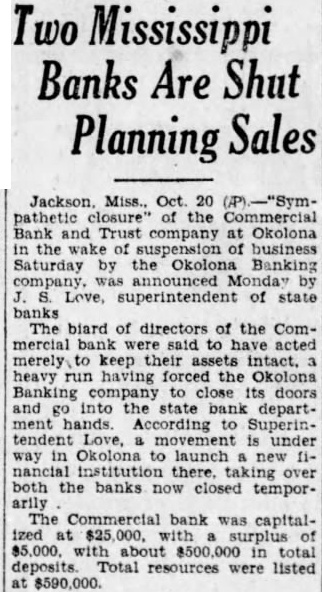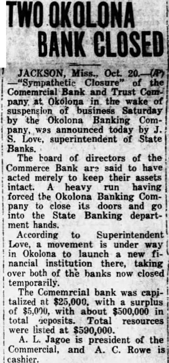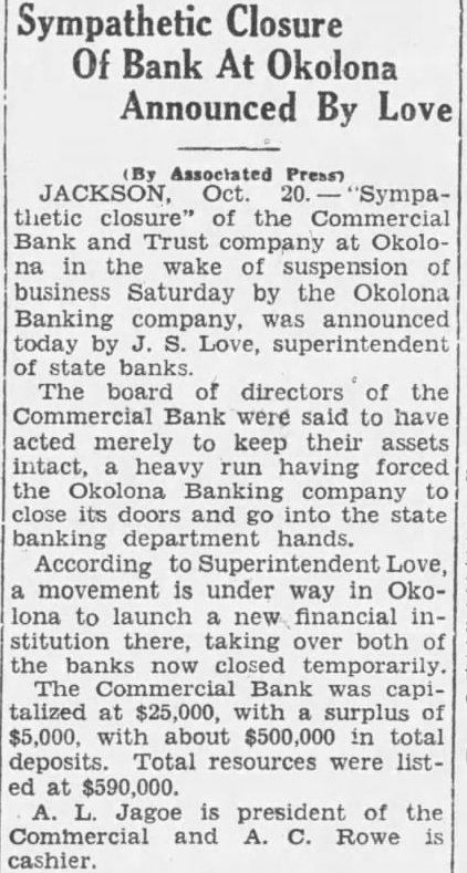 Sympathetic closure of the Commercial Bank and Trust Company at Okolona ... The board of directors of the Commercial bank was said to have acted merely to keep their assets intact, heavy run having forced the Okolona Banking Company to close its doors and go into the state banking department hands. (Commercial closed 'in sympathy')