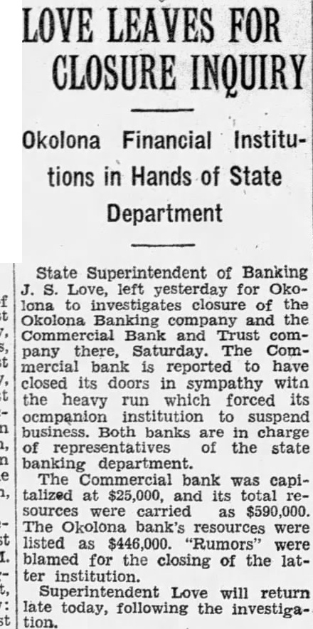 LOVE LEAVES FOR CLOSURE INQUIRY Okolona Financial Institutions in Hands of State Department State Superintendent of Banking J. S. Love, left yesterday for Okolona to investigates closure of the Okolona Banking company and the Commercial Bank and Trust company there, Saturday. The Commercial bank is reported to have closed its doors in sympathy with the heavy run which forced its ocmpanion institution to suspend business. Both banks are in charge of representatives of the state banking department. The Commercial bank was capitalized at $25,000, and its total resources were carried as $590,000. The Okolona bank's resources were listed as $446,000. "Rumors" were blamed for the closing of the latter institution. Superintendent Love will return late today, following the investigation.