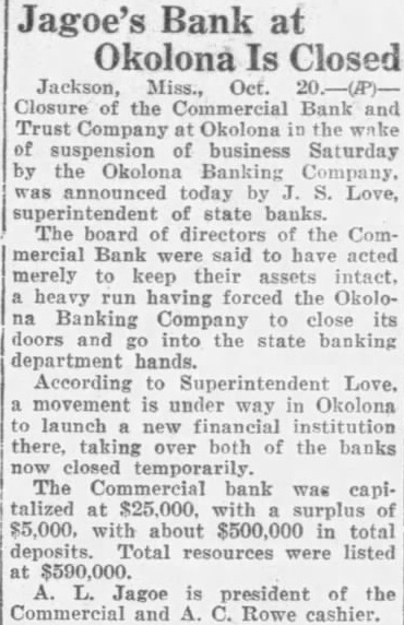 Jagoe's Bank at Okolona Is Closed Jackson, Miss., Oct. Closure the Commercial Bank and Trust Company Okolona business Saturday the Okolona Banking today Love, state banks. The board the Commercial Bank said to acted merely keep their intact. heavy having forced the OkoloBanking Company close its doors and into the state banking department According Superintendent Love. under way Okolona launch there, taking over both of the banks The Commercial bank was capitalized $25,000. with surplus $5,000, with about $500,000 in total deposits. Total resources were listed $590,000. Jagoe president the and Rowe cashier.