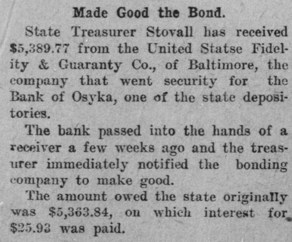 Made Good the Bond. State Treasurer Stovall has received $5,389.77 from the United Statse Fidelity & Guaranty Co., of Baltimore, the company that went security for the Bank of Osyka, one of the state depositories. The bank passed into the hands of a receiver a few weeks ago and the treasurer immediately notified the bonding company to make good. The amount owed the state originally was $5,363.84, on which interest for $25.93 was paid.