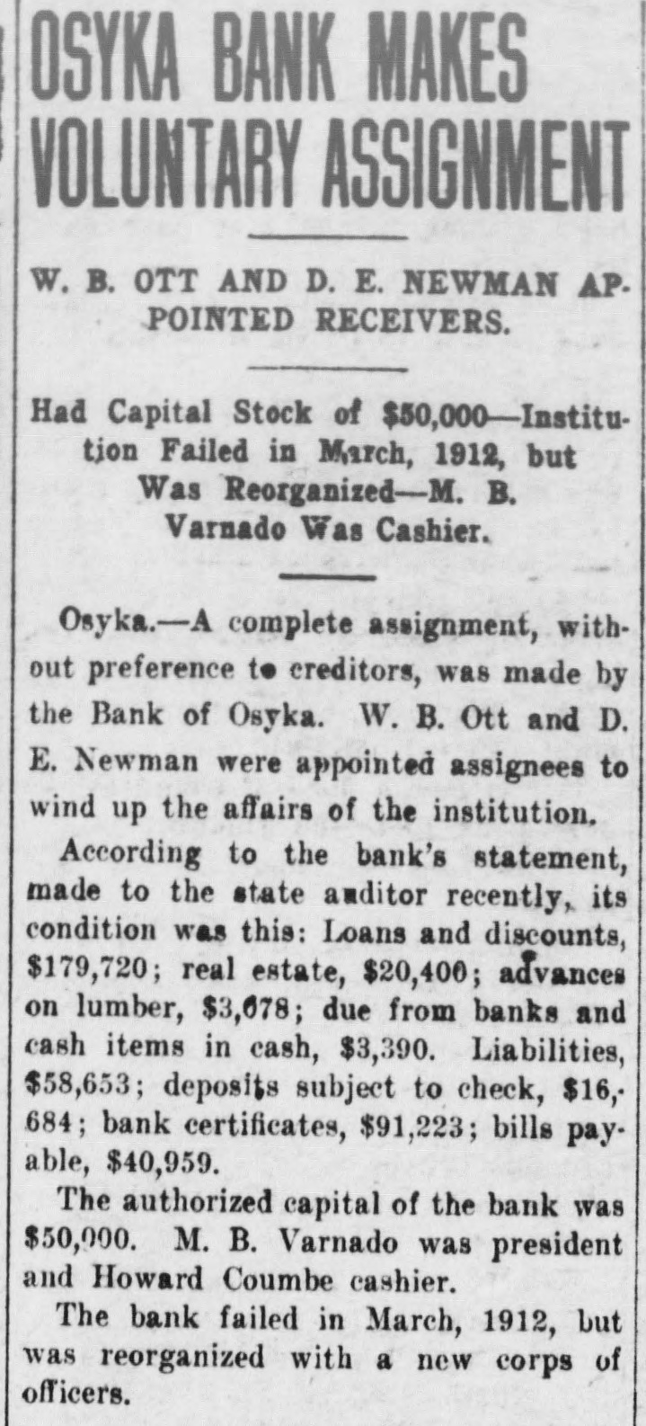OSYKA BANK MAKES VOLUNTARY ASSIGNMENT W. B. OTT AND D. E. NEWMAN AP. POINTED RECEIVERS. Had Capital Stock of $50,000-Institution Failed in March, 1912, but Was Reorganized-M. B. Varnado Was Cashier. Osyka.-A complete assignment, without preference to creditors, was made by the Bank of Osyka. W. B. Ott and D. E. Newman were appointed assignees to wind up the affairs of the institution. According to the bank's statement, made to the state auditor recently, its condition was this: Loans and discounts, $179,720; real estate, $20,400; advances on lumber, $3,678; due from banks and cash items in cash, $3,390. Liabilities, $58,653; deposits subject to check, $16,684; bank certificates, $91,223; bills payable, $40,959. The authorized capital of the bank was $50,000. M. B. Varnado was president and Howard Coumbe cashier. The bank failed in March, 1912, but was reorganized with a new corps of officers.