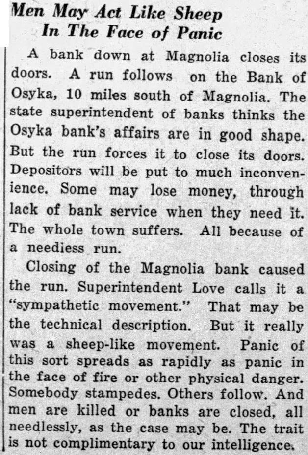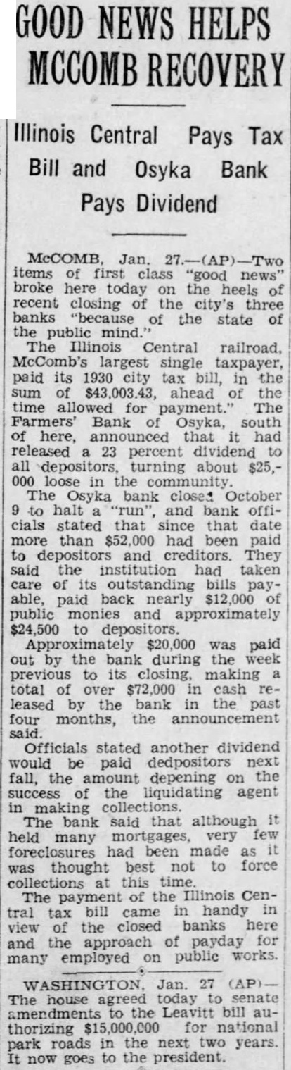 Jan. items first class news' broke here today the heels of recent closing the city's three banks "because the state of public Illinois Central McComb's largest single taxpayer, paid its tax bill, in ahead the time allowed for payment." The Bank Osyka, south here, that had released 23 percent dividend all turning about $25,000 loose in the Osyka closed October halt and bank officials stated that since that date more than had been paid depositors and creditors. They said the institution had of outstanding paypaid back public monies and approximately depositors. was paid out by the bank during the week previous to its making total of over $72,000 cash leased by the bank the past months, the announcement Officials stated another dividend would paid dedpositors next fall, the amount depening on the success liquidating agent making bank said that although held many foreclosures had been made was thought best not to force this time The the Illinois Central tax bill came handy in view the closed banks here the payday for and employed public works. many
