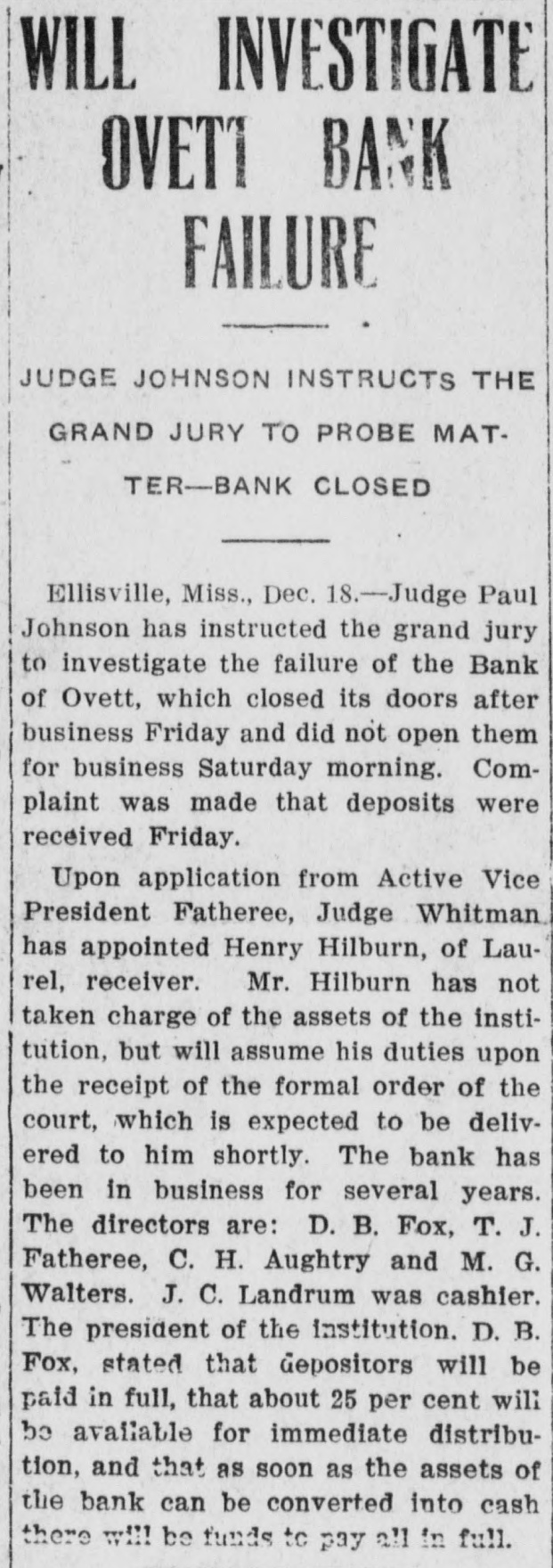 WILL INVESTIGATE OVETT BANK FAILURE JUDGE JOHNSON INSTRUCTS THE GRAND JURY TO PROBE MATTER-BANK CLOSED Ellisville, Miss., Dec. 18.-Judge Paul Johnson has instructed the grand jury to investigate the failure of the Bank of Ovett, which closed its doors after business Friday and did not open them for business Saturday morning. Complaint was made that deposits were received Friday. Upon application from Active Vice President Fatheree, Judge Whitman has appointed Henry Hilburn, of Laurel, receiver. Mr. Hilburn has not taken charge of the assets of the institution, but will assume his duties upon the receipt of the formal order of the court, which is expected to be delivered to him shortly. The bank has been in business for several years. The directors are: D. B. Fox, T. J. Fatheree, C. H. Aughtry and M. G. Walters. J. C. Landrum was cashier. The president of the institution. D. B. Fox, stated that depositors will be paid in full, that about 25 per cent will be available for immediate distribution, and that as soon as the assets of the bank can be converted into cash there will be funds to pay all in full.