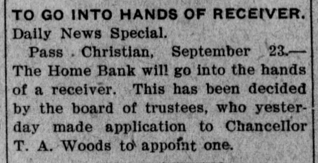 TO GO INTO HANDS OF RECEIVER. Daily News Special. Pass Christian, September 23.The Home Bank will go into the hands of a receiver. This has been decided by the board of trustees, who yesterday made application to Chancellor T. A. Woods to appoint one.