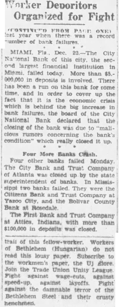 Deporitors Organized for Fight FROM bank failures. MIAMI. Dec. City Bank this the largest financial institution failed today. More than deposits involved. There been run this bank for come and order the up the crisis behind big bank failures. board the City National Bank declared that the closing of the bank was due to "malirumors which closed Four Four other banks failed Monday The City Bank and Trust Company Atlanta closed the of banks. In Missisbanks the Citizens Bank Trust Company Yazoo and the Bolivar County Bank Rosedale First Bank and Trust Company Indiana, with more than $100,000 deposits closed. Workers Bethlehem (Hungarian) do not this paper. Subscribe workmen's the the Trade Union Unity League Fight against against against Fight against the Steel and crusty