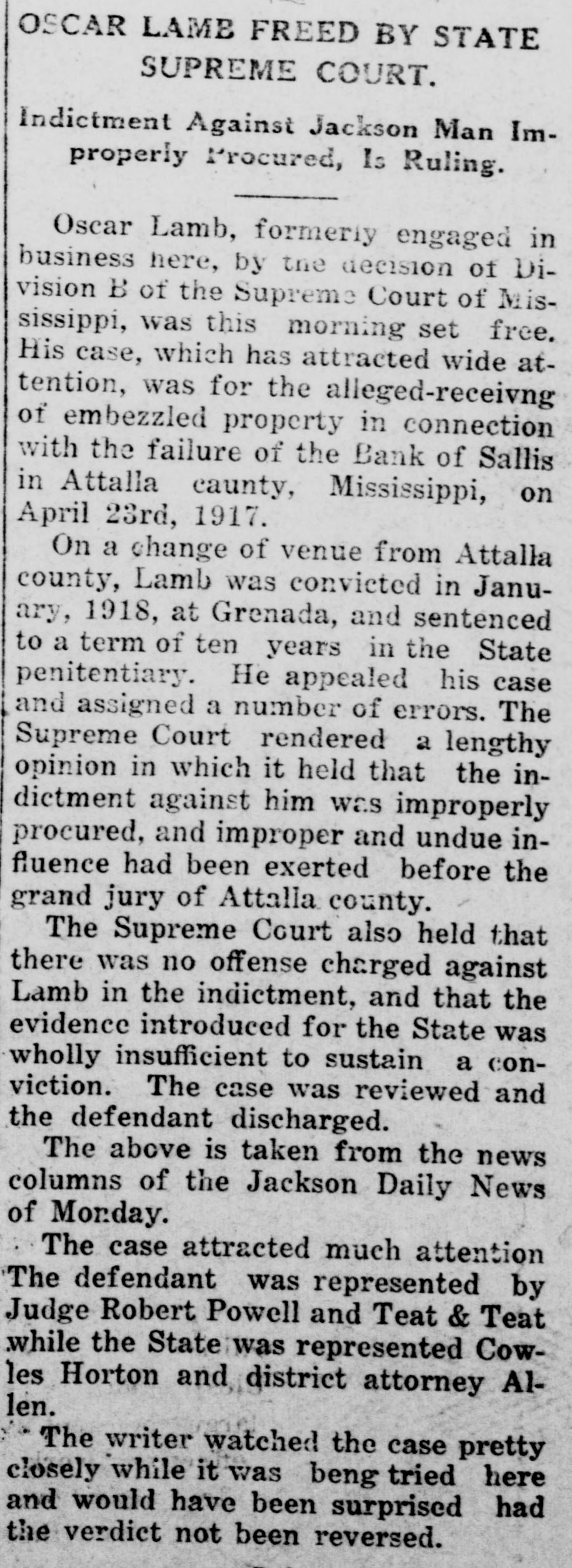 Jackson. Oscar Lamb, former merchant of this city, sentenced to 10 years in the penitentiary for alleged receiving of embezzled property in connection with the failure of the Bank of Sallis, Attilla county, has been set free by the supreme court Lamb was convicted and sentenced in January, this year, when tried at Grenada. He appealed to the supreme court. The latter tribunal held that the indictment was improperly procured, and that undue influence had been exerted before the grand jury of Attills, county.