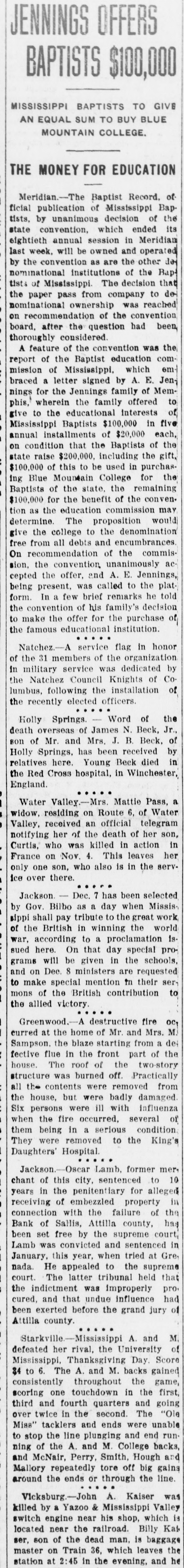 A feature of the convention was the report of the Baptist education commission of Mississippi, which embraced a letter signed by A. E. Jennings for the Jennings family of Memphis, wherein the family offered to give to the educational interests of Mississippi Baptists $100,000 in five annual installments of $20,000 each, on condition that the Baptists of the state raise $200,000, including the gift, $100,000 of this to be used in purchasing Blue Mountain College for the Baptists of the state, the remaining $100,000 for the benefit of the convention as the education commission may determine. The proposition would give the college to the denomination free from all debts and encumbrances. On recommendation of the commission, the convention unanimously accepted the offer, and A. E. Jennings, being present, was called to the platform. In a few brief remarks he told the convention of his family's decision to make the offer for the purchase of the famous educational institution.