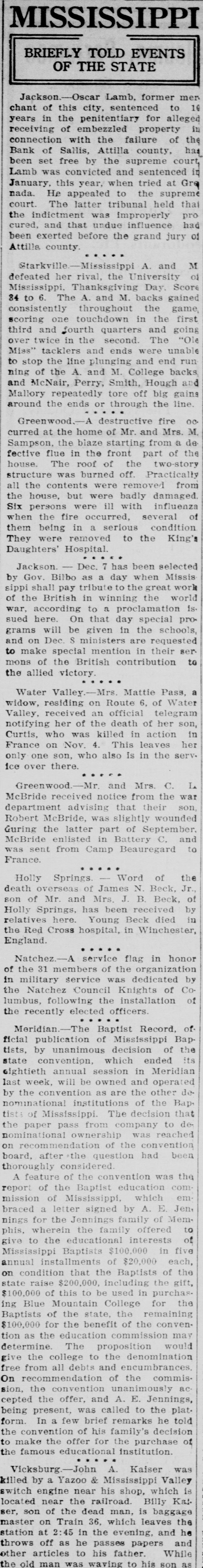 Water Valley. Mrs. Mattie Pass, a widow, residing on Route 6, of Water Valley, received an official telegram notifying her of the death of her son, Curtis, who was killed in action in France on Nov. 4. This leaves her only one son, who also is in the service over there.