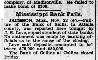 JACKSON, Miss., Nov. 24 Bank of Sallis failed to open for business Saturday J. S. Love, superintendent of state banks, announced the closing the Sallis bank, which is in Attala county. Deposits were estimated at $75,000, with resources $200,000. Friday last week the Bank of Collins, at Collins, closed its doors.