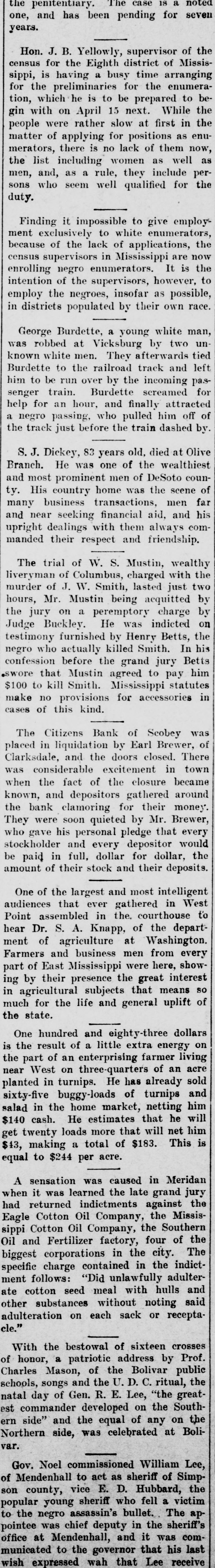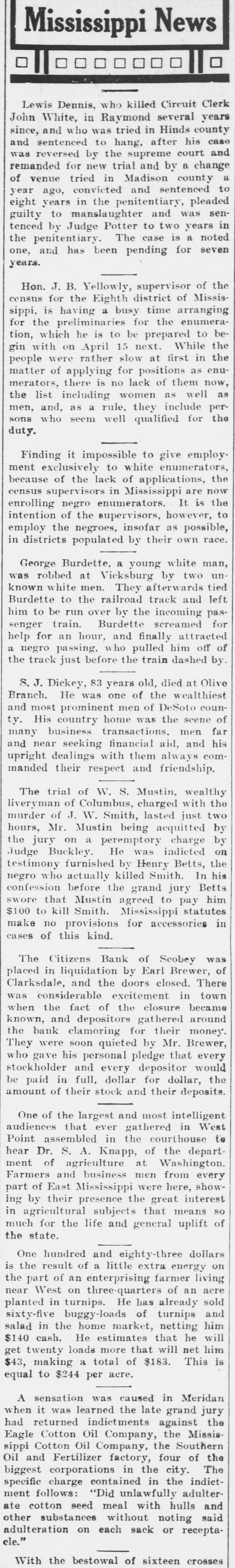 Lewis Dennis, who killed Circuit Clerk John White, in Raymond several years since, and who was tried in Hinds county and sentenced to hang, after his case was reversed by the supreme court and remanded for new trial and by a change of venue tried in Madison county a year ago, convicted and sentenced to eight years in the penitentiary, pleaded guilty to manslaughter and was sentenced by Judge Potter to two years in the penitentiary. The case is a noted one, and has been pending for seven years. Mon. J. B. Yellowly, supervisor of the census for the Eighth district of Mississippl, is having a busy time arranging for the preliminaries for the enumeration, which he is to be prepared to begin with on April 15 next. While the people were rather slow at first in the matter of applying for positions as enumerators, there is no lack of them now, the list including women as well as men, and, as a rule, they include persons who seem well qualified for the duty. Finding it impossible to give employment exclusively to white enumerators, because of the lack of applications, the census supervisors in Mississippi are now enrolling negro enumerators. It is the intention of the supervisors, however, to employ the negroes, insofar as possible, in districts populated by their own race. George Burdette, a young white man, was robbed at Vicksburg by two unknown white men. They afterwards tied Burdette to the railroad track and left him to be run over by the incoming passenger train. Burdette screamed for help for an hour, and finally attracted a negro passing, who pulled him off of the track just before the train dashed by. S. J. Dickey, 83 years old, died at Olive Branch. He was one of the wealthiest and most prominent men of DeSoto county. His country home was the scene of many business transactions, men far and near seeking financial aid, and his upright dealings with them always commanded their respect and friendship. The trial of W. S. Mustin, wealthy liveryman of Columbus, charged with the murder of J. W. Smith, lasted just two hours, Mr. Mustin being acquitted by the jury on a peremptory charge by Judge Buckley. He was indicted on testimony furnished by Henry Betts, the negro who actually killed Smith. In his confession before the grand jury Betts swore that Mustin agreed to pay him $100 to kill Smith. Mississippi statutes make no provisions for accessories in cases of this kind. The Citizens Bank of Scobey was placed in liquidation by Earl Brewer, of Clarksdale, and the doors closed. There was considerable excitement in town when the fact of the closure became known, and depositors gathered around the bank clamoring for their money. They were soon quieted by Mr. Brewer, who gavé his personal pledge that every stockholder and every depositor would be paid in full, dollar for dollar, the amount of their stock and their deposits. One of the largest and most intelligent audiences that ever gathered in West Point assembled in the courthouse to hear Dr. S. A. Knapp, of the department of agriculture at Washington. Farmers and business men from every part of East Mississippi were here, showing by their presence the great interest in agricultural subjects that means so much for the life and general uplift of the state. One hundred and eighty-three dollars is the result of a little extra energy on the part of an enterprising farmer living near West on three-quarters of an acre planted in turnips. He has already sold sixty-five buggy-loads of turnips and salad in the home market, netting him $140 cash. He estimates that he will get twenty loads more that will net him $43, making a total of $183. This is equal to $244 per acre. A sensation was caused in Meridan when it was learned the late grand jury had returned indictments against the Eagle Cotton Oil Company, the Mississippi Cotton Oil Company, the Southern Oil and Fertilizer factory, four of the biggest corporations in the city. The specific charge contained in the indictment follows: "Did unlawfully adulterate cotton seed meal with hulls and other substances without noting said adulteration on each sack or receptacle." With the bestowal of sixteen crosses of honor, a patriotic address by Prof. Charles Mason, of the Bolivar public schools, songs and the U. D. C. ritual, the natal day of Gen. R. E. Lee, "the greatest commander developed on the Southern side" and the equal of any on the Northern side, was celebrated at Bolivar. Gov. Noel commissioned William Lee, of Mendenhall to act as sheriff of Simpson county, vice E. D. Hubbard, the popular young sheriff who fell a victim to the negro assassin's bullet. The appointee was chief deputy in the sheriff's office at Mendenhall, and it was com municated to the governor that his last wish expressed wah that Lee receive