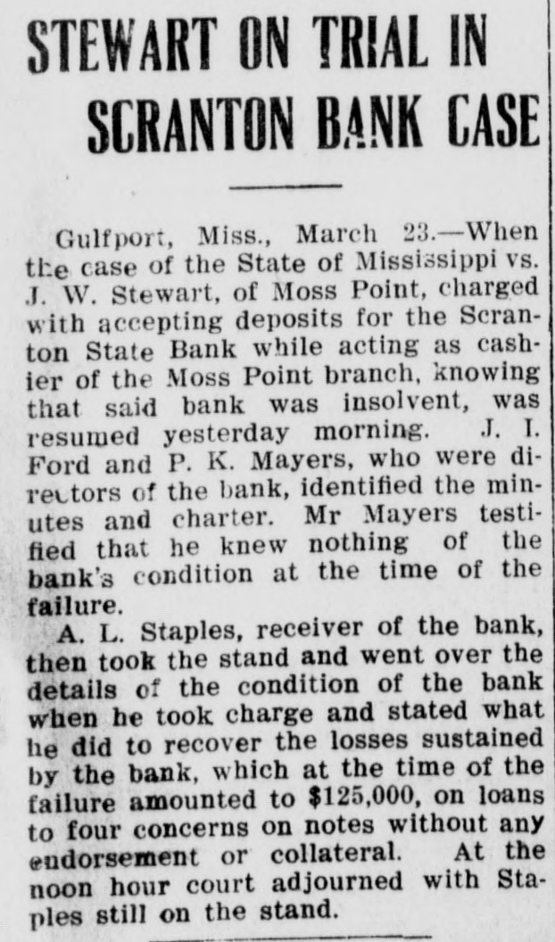 STEWART ON TRIAL IN SCRANTON BANK CASE Gulfport, Miss., March 23. - When the case of the State of Mississippi VS. J. W. Stewart, of Moss Point, charged with accepting deposits for the Scranton State Bank while acting as cashier of the Moss Point branch, knowing that said bank was insolvent, was resumed yesterday morning. J. I. Ford and P. K. Mayers, who were directors of the bank, identified the minutes and charter. Mr Mayers testified that he knew nothing of the bank's condition at the time of the failure. A. L. Staples, receiver of the bank, then took the stand and went over the details of the condition of the bank when he took charge and stated what he did to recover the losses sustained by the bank, which at the time of the failure amounted to $125,000, on loans to four concerns on notes without any endorsement or collateral. At the noon hour court adjourned with Staples still on the stand.