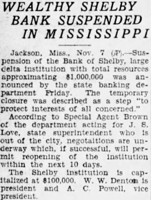 SHELBY BANK IN MISSISSIPPI Jackson. Nov the Bank of Shelby, large delta institution total was nounced the state banking department The temporary closure was described step "to protect interests of all concerned According to Special Agent Brown the for Love, state superintendent who of the negotaltions are underway which, if successful. will permit reopening the institution within the 10 days. Shelby institution is capitalized W. Denton president and Powell, vice president