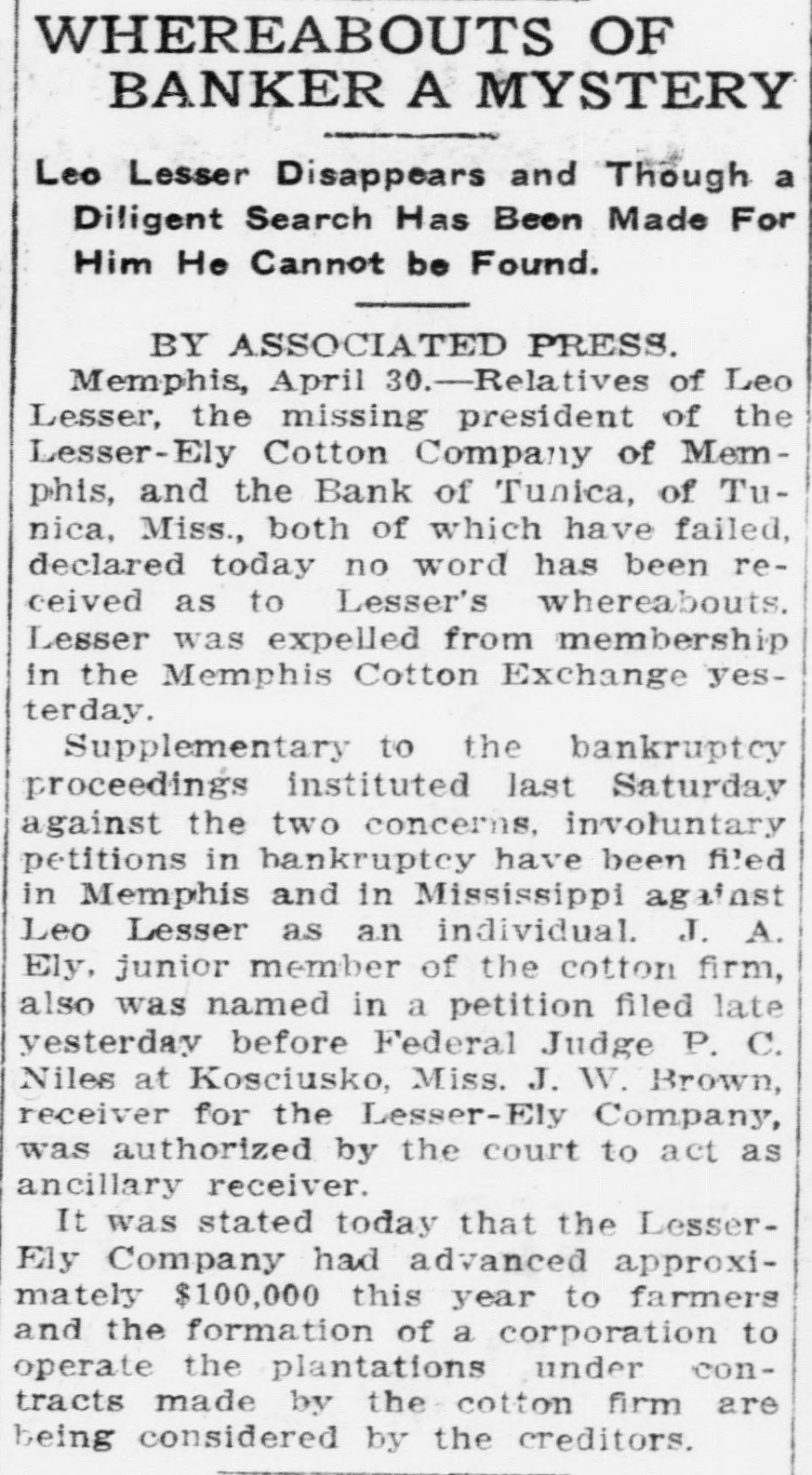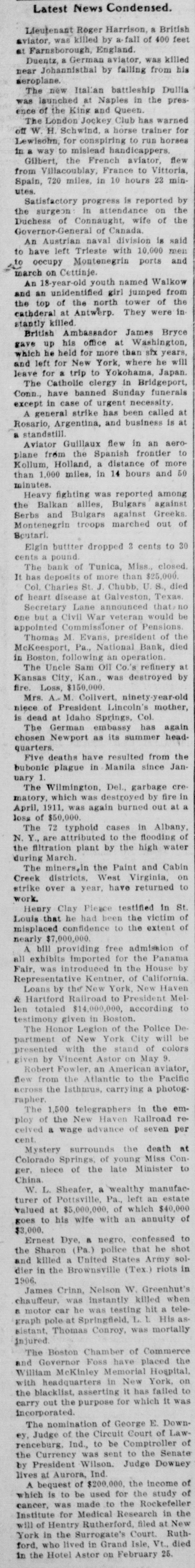 Latest News Condensed. Lieutenant Roger Harrison, a British aviator, was killed by a fall of 400 feet at Farnsborough, England. Duentz, a German aviator, was killed near Johannistbal by falling from his aeroplane. The new Italian battleship Dullia was launched at Naples in the presence of the King and Queen. The London Jockey Club has warned off W.H. Schwind, a horse trainer for Lewisohn, for conspiring to run horses in a way to mislead handicappers. Gilbert, the French aviator, flew from Villacoublay, France to Vittoria, Spain, 720 miles. in 10 hours 23 minutes. Satisfactory progress is reported by the surgeon in attendance on the Duchess of Connaught, wife of the Governor-General of Canada. An Austrian naval division is said to have left Trieste with 10,000 men to occupy Montenegrin ports and march on Cettinje. An 18-year-old youth named Walkow and an unidentified girl jumped from the top of the north tower of the cathderal at Antwerp. They were in stantly killed. British Ambassador James Bryce gave up his office at Washington, which he held for more than six years, and left for New York, where he will leave for a trip to Yokohama, Japan The Catholic clergy in Bridgeport, Conn., have banned Sunday funerals except in case of urgent necessity A general strike has been called at Rosario, Argentina, and business is at a standstill Aviator Guillaux flew in an aeroplane from the Spanish frontier to Kollum, Holland, a distance of more than 1,000 miles, in 14 hours and 50 minutes. Heavy fighting was reported among the Balkan allies, Bulgars against Serbs and Bulgars against Greeks Montenegrin troops marched out of Boutari. Elgin buttter dropped 3 cents to 30 cents pound The bank of Tunica, Miss. closed It has deposits of more than $25,000 Col. Charles St. J. Chubb, U.S., died of heart disease at Galveston, Texas. Secretary Lane announced that one but a Civil War veteran would be appointed Commissioner of Pensions Thomas M. Evans, president of the McKeesport, Pa., National Bank, died in Boston, following an operation The Uncle Sam Oil Co.'s refinery at Kansas City, Kan. was destroyed by fire. Loss, $150,000. Mrs. A.M. Collvert, ninety-year-old niece of President Lincoln's mother, is dead at Idaho Springs, Col. The German embassy has again chosen Newport as its summer headquarters. Five deaths have resulted from the bubonic plague in Manila since January The Wilmington, Del., garbage cre matory, which was destroyed by fire in April,1911, was again burned out at a loss of $50,000. The 72 typhoid cases in Albany, N. Y. are attributed to the flooding of the filtration plant by the high water during March. The miners,In the Paint and Cabin Creek districts, West Virginia, on strike over a year, have returned to work. Henry Clay Pience testified in St. Louis that he had been the victim of misplaced confidence to the extent of nearly $7,000,000. A bill providing free admission of all exhibits imported for the Panama Fair, was introduced in the House by Representative Kentner, of California. Loans by the New York, New Haven & Hartford Railroad to President Mellen totaled $14,000,000, according to testimony given in Boston. The Honor Legion of the Pollce Department of New York City will be presented with the stand of colors given by Vincent Astor on May 9. Robert Fowler. an American aviator, flew from the Atlantic to the Pacific across the Isthnus, carrying a photographer The 1,500 telegraphers in the employ of the New Haven Railroad recelved a wage advance of seven per cent Mystery surrounds the death at Colorado Springs, of young Miss Conger, niece of the late Minister to China. W. L. Sheafer, a wealthy manufacturer of Pottsville, Pa., left an estate valued at $5,000,000, of which $40,000 goes to his wife with an annuity of $3,000. Ernest Dye, a negro, confessed to the Sharon (Pa.) police that he shot and killed a United States Army soldier in the Brownsville (Tex.) riots in 1906. James Crinn, Nelson W. Greenhut's chauffeur, was instantly killed when a motor car he was testing hit a tele graph pole at Springfield, L 1. His as sistant, Thomas Conroy, was mortally injured The Boston Chamber of Commerce and Governor Foss have placed the William McKinley Memorial Hospital, with headquarters in New York, on the blacklist, asserting it has failed to carry out the purpose for which it was incorporated. The nomination of George E. Downey, Judge of the Circuit Court of Lawrenceburg. Ind., to be Comptroller of the Currency was sent to the Senate by President Wilson. Judge Downey lives at Aurora, Ind. A bequest of $200,000, the income of which is to be used for the study of cancer, was made to the Rockefeller Institute for Medical Research in the will of Hentry Rutherford, filed at New York in the Surrogate's Court. Ruthford, who lived in Grand Isle, Vt., died in the Hotel Astor on February 25.
