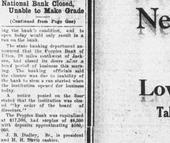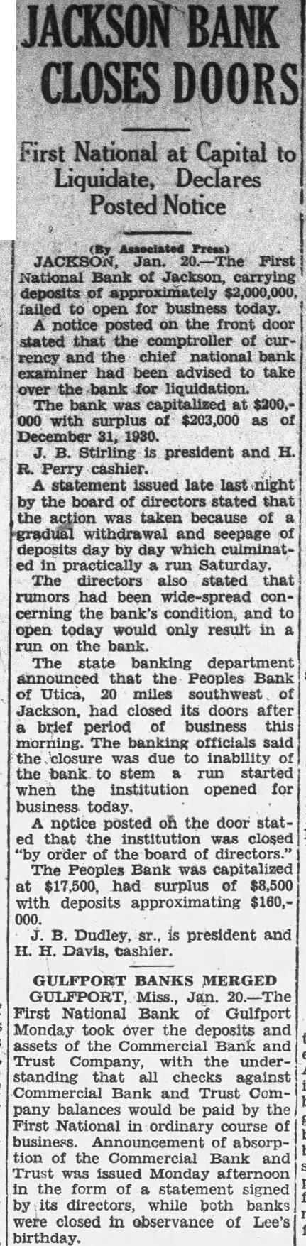 JACKSON BANK First National at Capital to Liquidate, Declares Press) Jan. First National Bank of Jackson, deposits of failed to open for today. notice posted on the front door stated that the comptroller currency and chief national bank examiner had been advised to take the bank for liquidation. The bank was capitalized $200,with surplus of $203,000 December 31, 1930. Stirling president and Perry cashier. statement issued late by the board of directors stated that the action was taken because of gradual withdrawal and seepage deposits day by day which in practically Saturday. The directors stated that rumors had been wide-spread concerning the bank's condition, and to open today would only result in run on the bank. The state banking department announced that the Peoples Bank Utica, 20 miles southwest of Jackson, had closed its doors after brief period of business this morning. The banking officials said the closure was due inability the bank stem started when institution opened for business today. notice posted on the door statthat the institution was closed order the board of directors. The Peoples was capitalized $17,500, had surplus of $8,500 with deposits approximating $160,Dudley, is president and Davis, cashier. GULFPORT BANKS MERGED First National Bank of Gulfport Monday took over the deposits and assets of the Bank and Trust Company, with the understanding that all checks against Bank and Trust Company balances would be paid by the First National in ordinary course of business. of absorption the Commercial Bank and Trust Monday afternoon form of statement signed by its directors, while both banks were closed in observance of Lee's birthday.