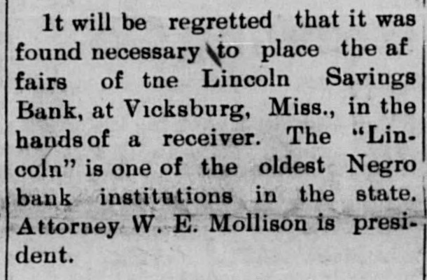 1t will be regretted that it was found necessary to place the af fairs of tne Lincoln Savings Bank, at Vicksburg, Miss., in the hands of a receiver. The "Lincoln" is one of the oldest Negro bank institutions in the state. Attorney W. E. Mollison is president.