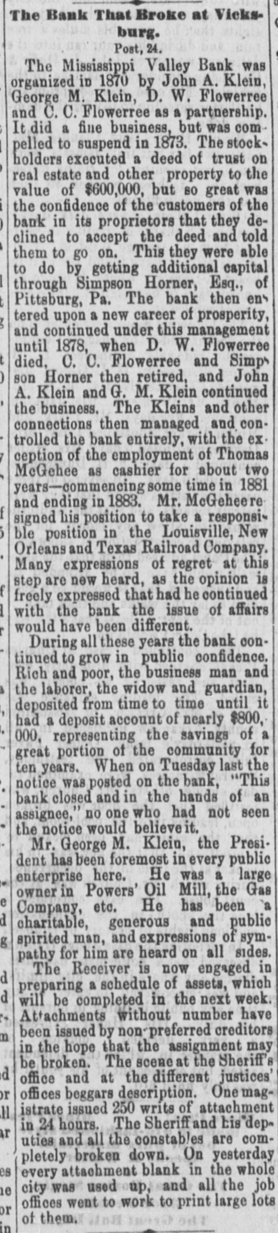 National Bank, Second National Bank, Manufacturers' National Bank and Na tional Bank of Commerce. Vicksburg. VICKSBURG, September 26.-The follow. ing circular has just been issued: Owing to the deranged condition of mon etary affairs throughout the country, and the action of banking institutions in other cities. we have deemed it prudent and in the interest of our depositors that we should similarly suspend payment for thirty days. There can be no losa to our depositors. JOHN A. KLEIN. President Mississippi Valley Bank. B. R. THOMAS. President Vicksburg Bank. BENJAMIN A. LEE, Cashier Freedmen's Bank. London. LONDON. September 26, L-American securities excited. Large business and wide inactuations. There is much uneasiness. Later.-American securities Hat: declined heavily. Philadelphia. PHILADELPHIA, September i-A state ment i made of the assets and liabilities of Jay Cooke & Co., of Philadelphia. New York and Washington, placing their liabilities at slightly over $7,900,000: their assets, including bills receivable. bank stock, bonds. real estate and loans to the Northern Pacific Railroad Company. show a balance of nearly $16,000,000. half of which appears to be Northern Pacific railroad stock. Indianapolis. INDIANAPOLIS. September -The panic of vesterday has entirely disappeared. At the opening to-day there was a light run on Ritzingers & Sharp's and Fletcher's banks by small depositors, but all demands were promptly met. without resort to the rule adopted by the Clearing House last night. Nearly all the banks report that their de posita to-day have exceeded the amounts withdrawn. The savingsbanks have met all demands promptly. and, like the other banks. claim that their deposits have exceeded the amount called for. The general impression prevails that Woollen. Webb & Co. will resume in a few days. Cincinnati. CINCINNATI. September 26.-The second day under the new bank arrangement has a the apbe that matters were after passed Clearing peared bank satisfactorily to House hours, Association the At genera! meeting this opinion atternoon working of favorably. The banks and bankers seemed thoroughly in sympathy with the plan adopted, and there 14 manifest a cheerful acquiescence in the expressed wish of the majority in relation to all details of emovement. The association at this meeting adopted resolution, the nature of which was foreshadowed in last night's dispatches. This provides that al currency deposited here after may be drawn upon at the will of the depositor. This makes for future deposits new rule from that applying to old ones, and will invite currency from many martera where it i. now Iving unused. All the securities demanded by the committee in charge of the matter have been forth. coming. The general feeling here to-day is one of satisfaction in relation to the action of the banks. The news from Chicago had a depressing effect on Change. but did not produce a panicky feeling. There has been but little doing in general markets. Thing are nearly at a stand still. It is almost im. possible to negotiate drafts at present, and as the movement of the hog product 14 almost suspended Buyers are indisposed to make purchases, and holders have no inclination to throw stocks on a market which is unprepared to receive them. Basines. men are as rapidly as pos. sible adapting themselves to the changed circumstances and the whole temper of the people is to give and bear the pinch till con. fidence shall be restored and the blockade relieved St. Louis. St. Lour September H.-The action of the banks in this city last night seems to be generally approved by the mercantile com munity. and an improved and comparatively buovant feeling was manifested this morning. but when the news came that several Chicago bank had closed their doors a deep anxiety and apprehension immediately sprung up. and business on Change wasalmost entirely stopped. Many regular banks have so far done their usual business. paying al checks presented. while others have conformed to the rule adopted last night. and paid only small amounts. To-day has passed with no excitement, but there is deep anxiety as to the result of the present disturbed condition of affairs. Men of all classes are filled with apprehen sion. Affairs have been quiet among the banks. The non-payment of currency plan adopted last night has worked well, and has met with general approval. There have been no runs worthy of mention. Most of the savings banks have promptly met all demands and their de posita have exceeded the amount paid out. Many depositors who withdrew their accounts deposited again during the day, and confidence was largely restored. The volume of business at the regular banks decreased somewhat, but no one has suffered for want of money. The deposits in these banks have also been in excess of the amount paid out, although the day closes with an improved feeling and a brighter hope for the future. Augusta. AUGUSTA. Ga. September 26.--There is better feeling, but the stringency continues. Nothing doing in the cotton market. The First National Bank will not suspend. The deposits to-day were nearly equal to the amount checked out. No commercial paper discounted. The suspended banks are per