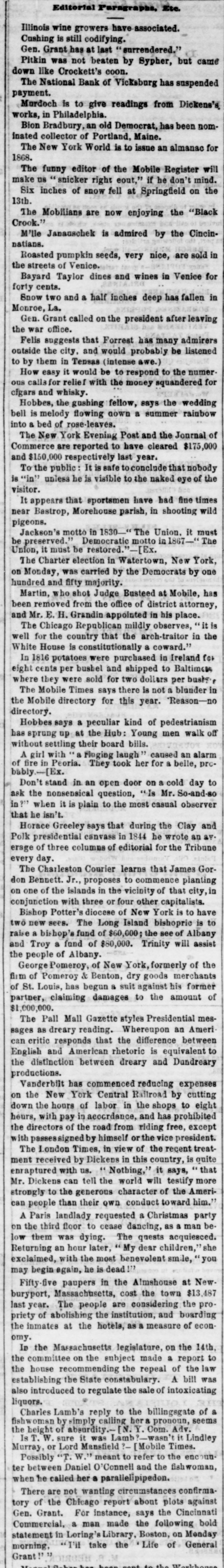 "> Illinois wine growers have associated. IIII8 of Cushing Gen. Grant has at last "surrendered." Pitkin was not beaten by Sypher, but came down like Crockett's coon. The National Bank of Vicksburg has suspended payment. Murdoch is to give readings from Dickens's works, in Philadelphia. Bion Bradbury, an old Democrat, has been nominated collector of Portland, Maine. The New York World is to issue an almanac for *8981 The funny editor of the Mobile Register will make us snicker right eout," if he don't mind. our uo Speing 18 IIej MOUS JO inches *!S 1319. The Mobilians are now enjoying the "Black Crook." M'lle Janauschek is admired by the Cincinnatians. Roasted pumpkin seeds, very nice, are sold in the streets of Venice. Bayard Taylor dines and wines in Venice for forty cents. Snow two and a half inches deep has fallen in I Gen. Grant called on the president after leaving the war office. Felis suggests that Forrest has many admirers outside the city, and would probably be listened to by them in Tensas (intense awe.) How easy it would be to respond to the numerous calls for relief with the money squandered for cigars and whisky. Hobbes, the gushing fellow, says the wedding Paintown secume B UMOD Homing melopy s! 1100 into a bed of rose-leaves. The New York Evening Post and the Journal of Commerce are reported to have cleared $175,000 and $150,000 respectively last year. To the public It is safe to conclude that nobody our Jo eye persu ey: 01 visible 8[ an unless " visitor. It appears that sportsmen have had fine times near Bastrop, Morehouse parish, in shooting wild pigeons. Jackson's motto in 1830-' The Union. it must be preserved.' Democratic motto in 1867-" The eq isnue # United The Charter election in Watertown, New York, on Monday, was carried by the Democrats by one hundred and fifty majority. seq Mobile, 18 Busteed expnf tous очм Marting, been removed from the office of district attorney, and Mr. E. H. Grandin appointed in his place. The Chicago Republican mildly observes, it is well for the country that the arch-traitor in the White House is constitutionally a coward." In 1816 potatoes were purchased in Ireland for eight cents per busbel and shipped to Baltimes where they were sold for two dollars per busts, The Mobile Times says there is not a blunder in the Mobile directory for this year. Reason-no directory. Hobbes says a peculiar kind of pedestrianism has sprung up at the Hub: Young men walk off without settling their board bills. alarm us cansed 48081 quit V of fire in Peoria. They took her for & belle, prcDon't stand in an open door on a cold day to ask the nonsensical question, "Is Mr. So-and-so in?" when it is plain to the most casual observer that he isn't. Horace Greeley says that during the Clay and AB us eq 1844 u! CERTASS Poll erage of three columns of editorial for the Tribune every day. The Charleston Courier learns that James Gordon Bennett. Jr., proposes to commence planting 1847 Jo the u! 1stands the Jo euo uo conjunction with three or four other capitalists. Bishop Potter's diocese of New York is to have 07 !! bish Island SuorT eye MeH OM1 Albany jo 000 our £000'09$ Jo punj 8 Pajse assist IIIM Truity *000'08$ JO punj 8 Tooy pus the people of Albany. George Pomeroy, of New York, formerly of the firm of Pomeroy & Benton, dry goods merchants sig Hus 8 unDeq has 48 Jo Jo tunous the 04 *000'000' I$ The Pall Mall Gazette styles Presidential messages as dreary reading. Whereupon an Ameri can critic responds that the difference between English and American rhetoric is equivalent to the distinction between dreary and Dundreary Vanderbilt has commenced reducing expenses on the New York Central Railroad by cutting down the hours of labor in the shops to eight heurs, with pay in accordance, and has prohibited the directors of the road from riding free, except with passessigned by himself or the vice president. The London Times, in view of the recent treatment received by Dickens in this country, is quite that 'slus # Nothing " 'sn THE Mr. Dickens can tell the world will testify more strongly to the generous character of the American people than their own conduct toward him." A Paris landlady requested a Christmas party on the third floor to cease dancing, as a man below them was dying. The quests acquiesced. Returning an hour later, My dear children," she exclaimed, with the most benevolent smile, you may begin again, he is dead 111 Fifty-five paupers in the Almshouse at New. buryport, Massachusetts, cost the town 487 last year. The people are considering the propriety of abolishing the institution, and boarding the inmates at the hotels, as measure of economy. In the Massachusetts legislature, on the 14th, the committee on the subject made a report to the house recommending the repeal of the law establishing the State constabulary. A bill was also introduced to regulate the sale of intoxicating liquors. Charles Lamb's reply to the billingsgate of a fishwoman by simply calling hera pronoun, seems the height of absurdity.- [N. Y. Com. Adv. 11 Thank SEM 11 sure 'M'LSI Murray, or Lord Mansfield ?- [Mobile Times. Possibly "T. W meant to refer to the encounter between Daniel O'Connell and the fishwoman, when he called her a paralielipipedon.