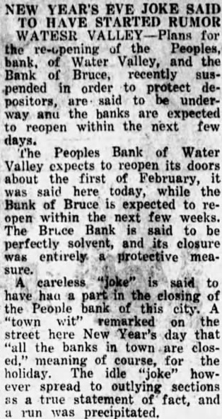 NEW YEAR'S EVE JOKE SAID TO STARTED RUMOR WATESR for re-opening Peoples, bank, Water Valley, and the Bank Bruce, recently suspended in order to protect depositors, said underway banks are expected reopen within the next few days. Peoples Bank of Water Valley its doors about the first February, was said here today, while the Bank of Bruce expected to reopen within next few weeks. The Bruce Bank said perfectly solvent, and its closure was entirely measure. careless to have the closing of the People bank of this city. "town remarked on the street here New Year's day that the banks in town closof course, for the holiday. The idle "joke" however spread to outlying sections true statement fact, and run was precipitated.