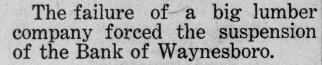 The failure of a big lumber company forced the suspension of the Bank of Waynesboro.