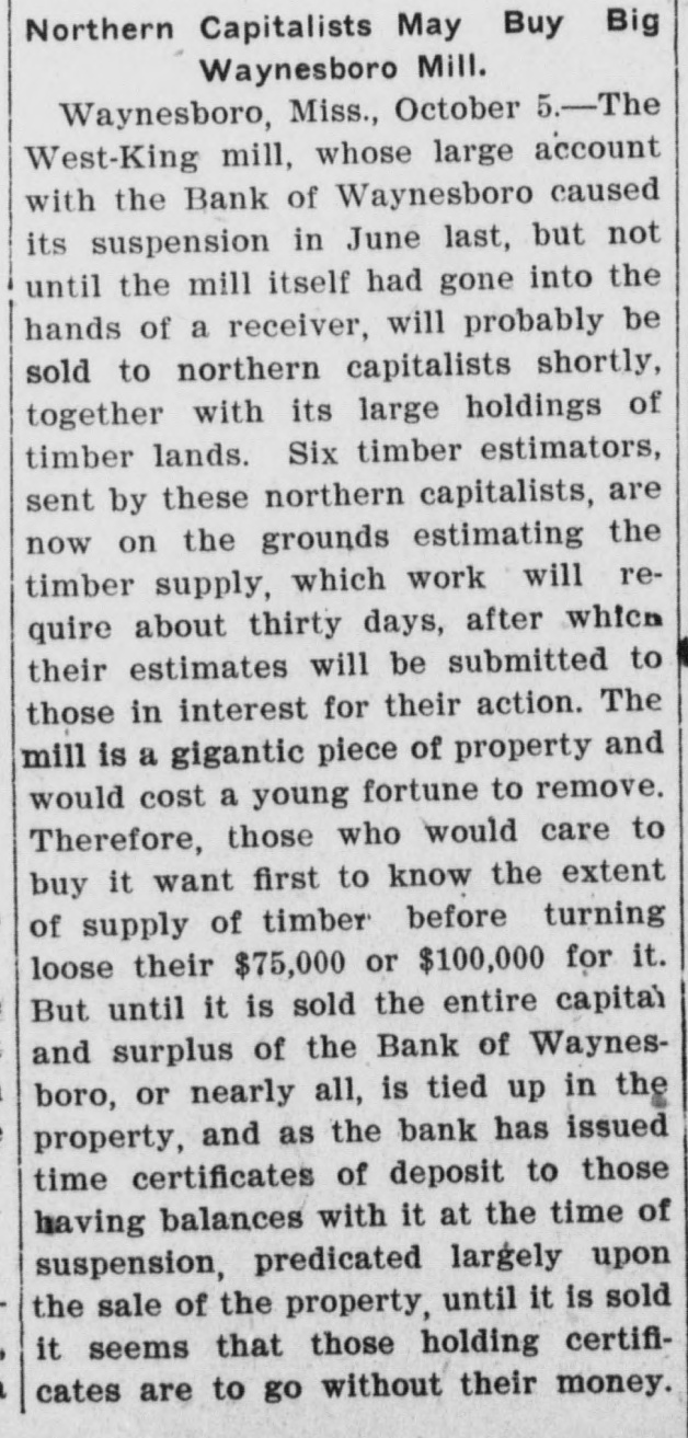 Northern Capitalists May Buy Big Waynesboro Mill. Waynesboro, Miss., October 5.-The West-King mill, whose large account with the Bank of Waynesboro caused its suspension in June last, but not until the mill itself had gone into the hands of a receiver, will probably be sold to northern capitalists shortly, together with its large holdings of timber lands. Six timber estimators, sent by these northern capitalists, are now on the grounds estimating the timber supply, which work will require about thirty days, after which their estimates will be submitted to those in interest for their action. The mill is a gigantic piece of property and would cost a young fortune to remove. Therefore, those who would care to buy it want first to know the extent of supply of timber before turning loose their $75,000 or $100,000 for it. But until it is sold the entire capital and surplus of the Bank of Waynesboro, or nearly all, is tied up in the property, and as the bank has issued time certificates of deposit to those having balances with it at the time of suspension, predicated largely upon the sale of the property, until it is sold it seems that those holding certificates are to go without their money.
