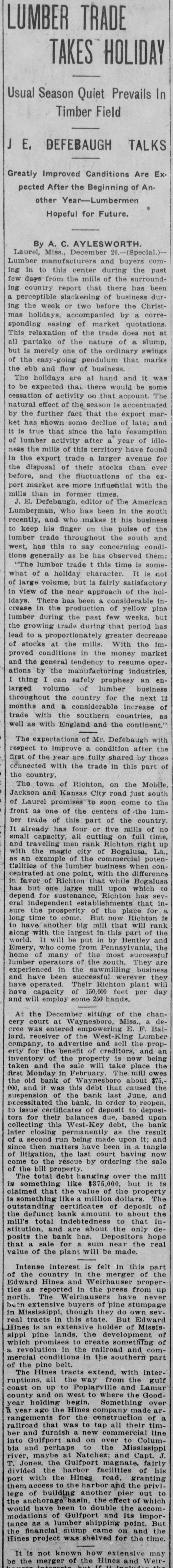 LUMBER TRADE TAKES HOLIDAY In Usual Season Quiet Prevails Timber Field J E. DEFEBAUGH TALKS Greatly Improved Canditions Are Expected After the Beginning of Another Year-Lumbermen Hopeful for Future. By A. C. AYLESWORTH. Laurel, Miss., December 6.-(Special Lumber manufacturers and buyers ing in to this center during the past few days from the mills of the surround ing country report that there has been perceptible slackening of business dur ing a the week or two before the Christmas holidays, accompanied by corresponding easing of market quotations. This relaxation of the trade does not at all partake of the nature of a slump. but is merely one of the ordinary swings the easy -going pendulum that marks the ebb and flow of business. The holidays are at hand and it was to be expected that there would be some cessation of activity on that account The natural effect of the season is accentuated by the further fact that the export market has shown some decline of late; and it is true that since the late resumption of lumber activity after year of idleness the mills of this territory have found in the export trade larger avenue for the disposal of their stocks than ever before, and the fluctuations of the export market are more influential with the mills than in former times E. Defebaugh, editor of the American Lumberman, who has been in the south recently and who makes it his business to keep his finger on the pulse of the lumber trade throughout the south and west, has this to say concerning conditions generally as he has observed them "The lumber trade this time is some what of holiday character It not of large volume, but is fairly satisfactory in view of the near approach of the hol1days. There has been considerable increase in the production of yellow pine lumber during the past few weeks, but the growing trade during that period has lead to proportionately greater decrease of stocks at the mills. With the improved conditions in the money market and the general tendency to resume operations by the manufacturing industries, I thing can safely prophesy an enlarged volume of lumber business throughout the country for the next 12 months and a considerable increase of trade with the southern countries, as well as with England and the continent." The expectations of Mr. Defebaugh with respect to improve a condition after the first of the year are fully shared by those connected with the trade in this part of the country The town of Richton, on the Mobile Jackson and Kansas City road just south of Laurel promises to soon come to the front as one of the centers of the lumber trade of this part of the country It already has four five mills of no small capacity all cutting on full time, and traveling men rank Richton right up with the magic city of Bogalusa, La. as an mple of the commercial potentialities of the lumber business when concentrated at one point with the difference in favor of Richton that while Bogalusa to has but one large mill upon which for has sevsustenance, Richton depend eral independent esta blishments that insure the prosperity of the place long time come. But now Richton is to have another big mill that will rank along with the largest in this part of the world. will be put in by Bentley and Emery who come from Pennsylvania, the home of many of the most lumber operators of the south. They are experienced in the sawmilling business and have been successful werever they have operated. Their Richton plant will day have capacity of 150,000 feet per and will employ some 250 hands. At the December sitting of the chancery court at Waynesboro, Miss. decree was entered empowering F Ballard, receiver of the West- King Lumber company, advertise and sell the property for the benefit of creditors, and an inventory of the property now being taken and the sale will take place the first Monday in February The mill owes the old bank of Waynesboro about $75.000. and it was this debt that caused the suspension of the bank last June, and necessitated the bank, in order to reopen, to issue certificates of deposit depositors for their balances due, based upon collecting this West-Key debt, the bank later closing permanently as the result of second run being made upon it; and since then matters have been tangle of litigation, the last court having now come to the rescue by ordering the sale of the bill property The total debt hanging over the mill is is something like $375,000. but it claimed that the value of the property is something like million dollars. The outstanding cert ificates of deposit of the defunct bank amount to about the mill's total indeb tedness to that institution, and are about the only deposits the bank has. Depositors hope that sale for sum near the real value of the plant will be made. Intense interest is felt in this part of the country in the merger of the Edward Hines and Weirhauser properties as reported in the press from up north. The Weirhausers have never been extensive buyers of pine stumpage in Mississippi, though they own sev. real tracts in this state But Edward Hines an extensive holder of Mississippi pine lands, the development which promises to create something of revolution in the railr oad and commercial conditions in the southern part of the pine belt. The Hines tracts extend, with interruptions, all the way from the gulf coast on up to Poplarville and Lamar county and on west to where the Goodyear holding begin Something over a year ago the Hines company made ar rangements for the construction of a railroad that was to tap all their timber and furnish new commercial line into Gulfport and on over to Columbia and perhaps to the Mississippi river, maybe at Natchez; and Capt. T. Jones, the Gulfport magnate, fairly divided the harbor facilities of his port with the Hines road, granting them access the harbor and the privi lege of building another pier out to the anchorage basin, the effect of which would have been to double the accommodations of Gulfport and its