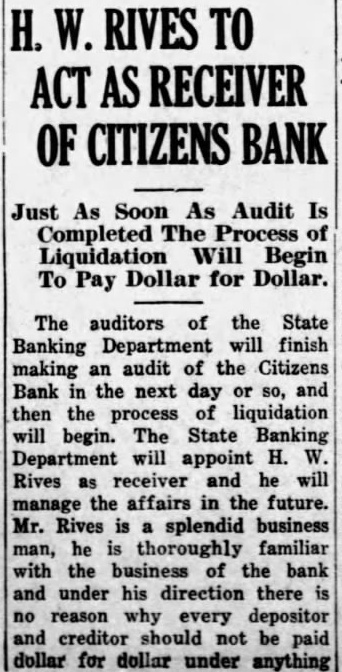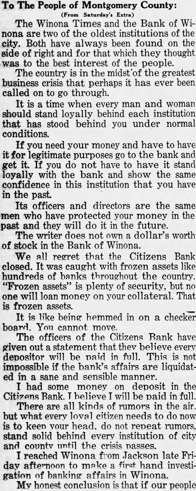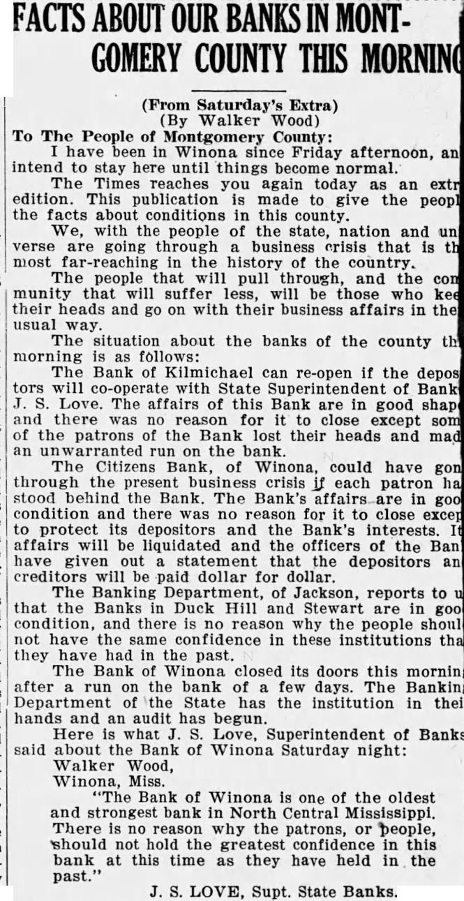 (By Walker Wood) To The People of Montgomery County: have been in Winona since Friday afternoon, and intend to stay here until things become normal. The Times reaches you again today as an extra edition. This publication is made to give the people the facts about conditions in this county. We, with the people of the state, nation and universe are going through a business crisis that is the most far-reaching in the history of the country. The people that will pull through, and the community that will suffer less, will be those who keep their heads and go on with their business affairs in their usual way. The situation is about the banks of the county this morning as follows: The Bank of Kilmichael can re-open if the depositors will co-operate with State Superintendent of Banks, Love. The affairs of this Bank are in good shape, and there was no reason for it to close except some of the patrons of the Bank lost their heads and made an unwarranted run on the bank. The Citizens Bank, of Winona, could have gone through the present business crisis if each patron had stood behind the Bank. The Bank's affairs are in good condition and there was no reason for it to close except to protect its depositors and the Bank's interests. Its affairs will be liquidated and the officers of the Bank have given out a statement that the depositors and creditors will be paid dollar for dollar. The Banking Department, of Jackson, reports to us that the Banks in Duck Hill and Stewart are in good condition, and there is no reason why the people should not have the same confidence in these institutions that they have had in the past. The Bank of Winona closed its doors this morning after a run on the bank of a few days. The Banking Department of the State has the institution in their hands and an audit has begun. Here is what J. S. Love, Superintendent of Banks, said about the Bank of Winona Saturday night: Walker Wood, Winona, Miss. "The Bank of Winona is one of the oldest and strongest bank in North Central Mississippi. There is no reason why the patrons, or people, should not hold the greatest confidence in this bank at this time as they have held in the past."