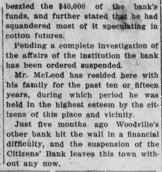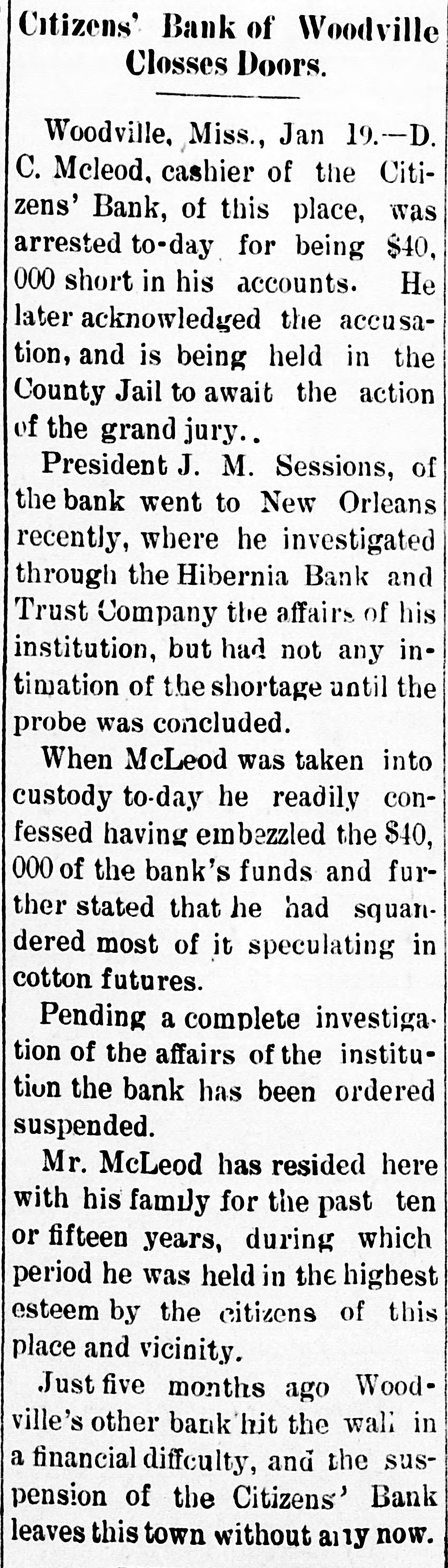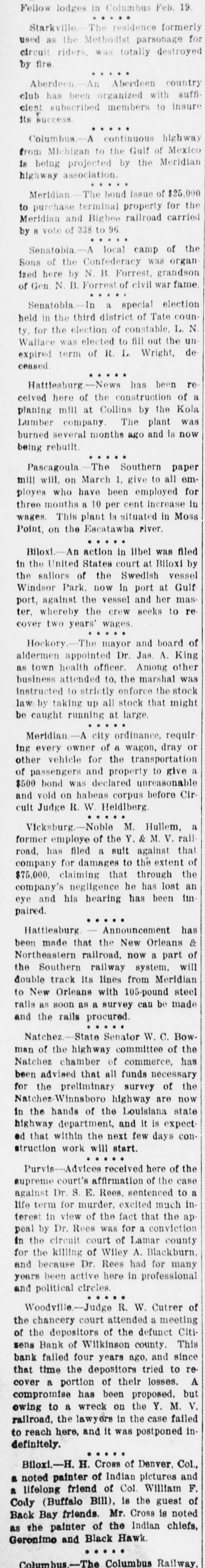 Fellow lodges in Columbus Feb. 19. Starkville The residence formerly used as the Methodist parsonage for circuit riders, was totally destroyed by fire. Aberdeen.-An Aberdeen country club has been organized with sufficient subscribed members to insure 1ts success Columbus.-A continuous highway from Michigan to the Gulf of Mexico 18 being projected by the Meridian highway association. Meridian-The bond issue of $25,000 to purchase terminal property for the Meridian and Bigbee railroad carried by a vote of 338 to 96 Senatobia.-A local camp of the Sons of the Confederacy was organ ized here by N. B. Forrest, grandson of Gen N. B. Forrest of civil war fame. Senatobia.-In a special election held in the third district of Tate county, for the election of constable, L. N. Wallace was elected to fill out the un expired term of R. L. Wright, deceased. Hattlesburg.-News has been re celved here of the construction of a planing mill at Collins by the Kola Lumber company. The plant was burned several months ago and is now being rebuilt. Pascagoula.-The Southern paper mill will, on March 1, give to all employes who have been employed for three months a 10 per cent increase in wages. This plant is situated in Moss Point, on the Escatawba river. Biloxi.-An action in libel was filed in the United States court at Biloxi by the sailors of the Swedish vessel Windsor Park. now in port at Gulf port, against the vessel and her master. whereby the crew seeks to recover two years' wages. Hockory. The mayor and board of aldermen appointed Dr. Jas. A. King as town health officer. Among other business attended to, the marshal was instructed to strictly enforce the stock law by taking up all stock that might be caught running at large. Meridian.-A city ordinance, requir Ing every owner of a wagon, dray or other vehicle for the transportation of passengers and property to give a $500 bond was declared unreasonable and void on habeas corpus before Circuit Judge R. W Heidlberg. Vicksburg.-Noble M. Hullem, a former employe of the Y. & M. V. railroad, has filed a suit against that company for damages to the extent of $75,000, claiming that through the company's negligence he has lost an eye and his hearing has been impaired. Hattiesburg Announcement has been made that the New Orleans & Northeastern railroad, now a part of the Southern railway system, will double track its lines from Meridian to New Orleans with 105-pound steel rails as soon as a survey can be made and the rails procured. Natchez.-State Senator W. C. Bowman of the highway committee of the Natchez chamber of commerce, has been advised that all funds necessary for the preliminary survey of the Natchez-Winnsboro highway are now in the hands of the Louisiana state highway department, and it is expected that within the next few days construction work will start. Purvis-Advices received here of the supreme court's affirmation of the case against Dr. S. E. Rees, sentenced to a life term for murder, excited much interest in view of the fact that the ap peal by Dr. Rees was for a conviction In the circuit court of Lamar county for the killing of Wiley A. Blackburn, and because Dr. Rees had for many years been active here in professional and political circles. Woodville.-Judge R. W. Cutrer of the chancery court attended a meeting of the depositors of the defunct Citizens Bank of Wilkinson county. This bank failed four years ago, and since that time the depositors tried to recover a portion of their losses. A compromise has been proposed. but owing to a wreck on the Y. M. V. railroad, the lawyers in the case failed to reach here, and it was postponed indefinitely. Biloxi.-H. H. Cross of Denver, Col.,